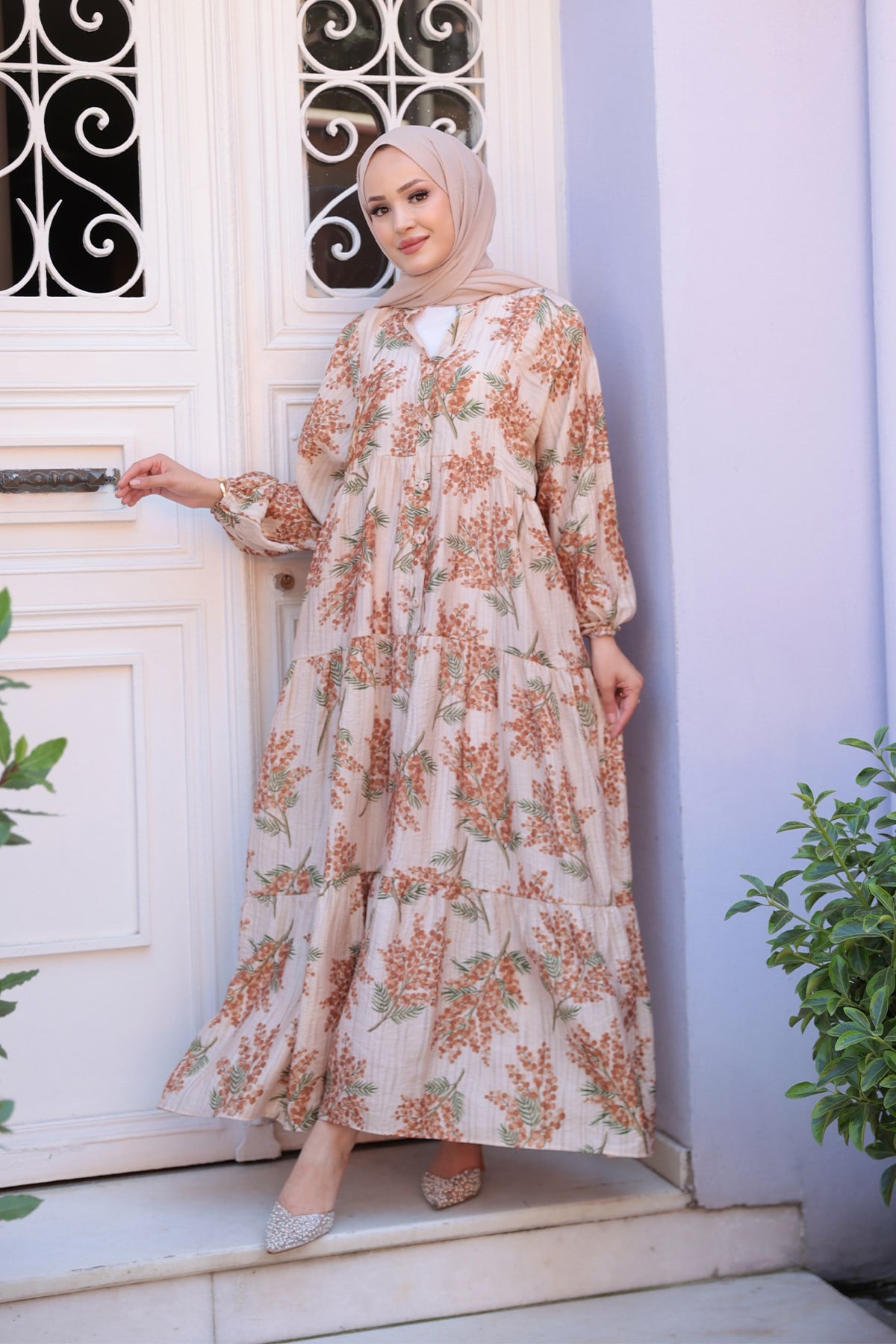 Ağaç Desenli Elbise Kahverengi