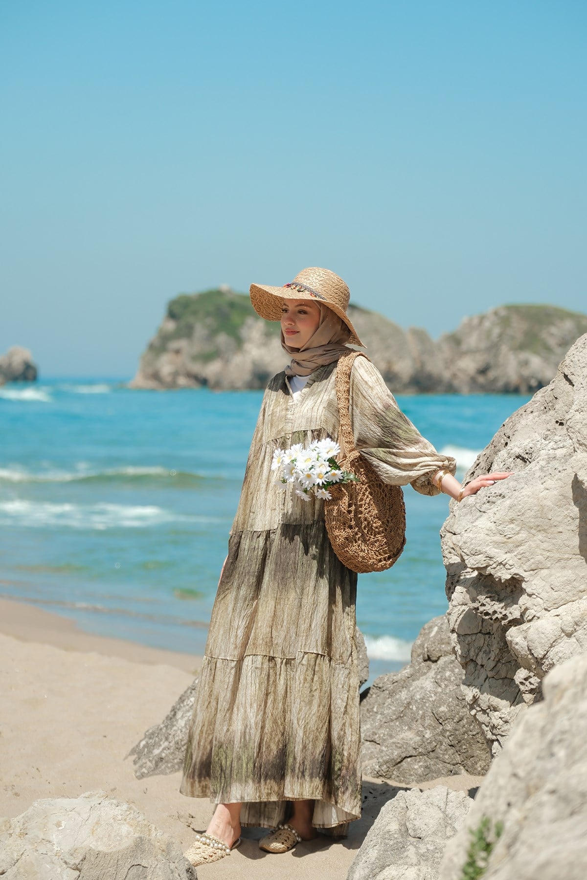 Ahşap Desenli Elbise Yeşil