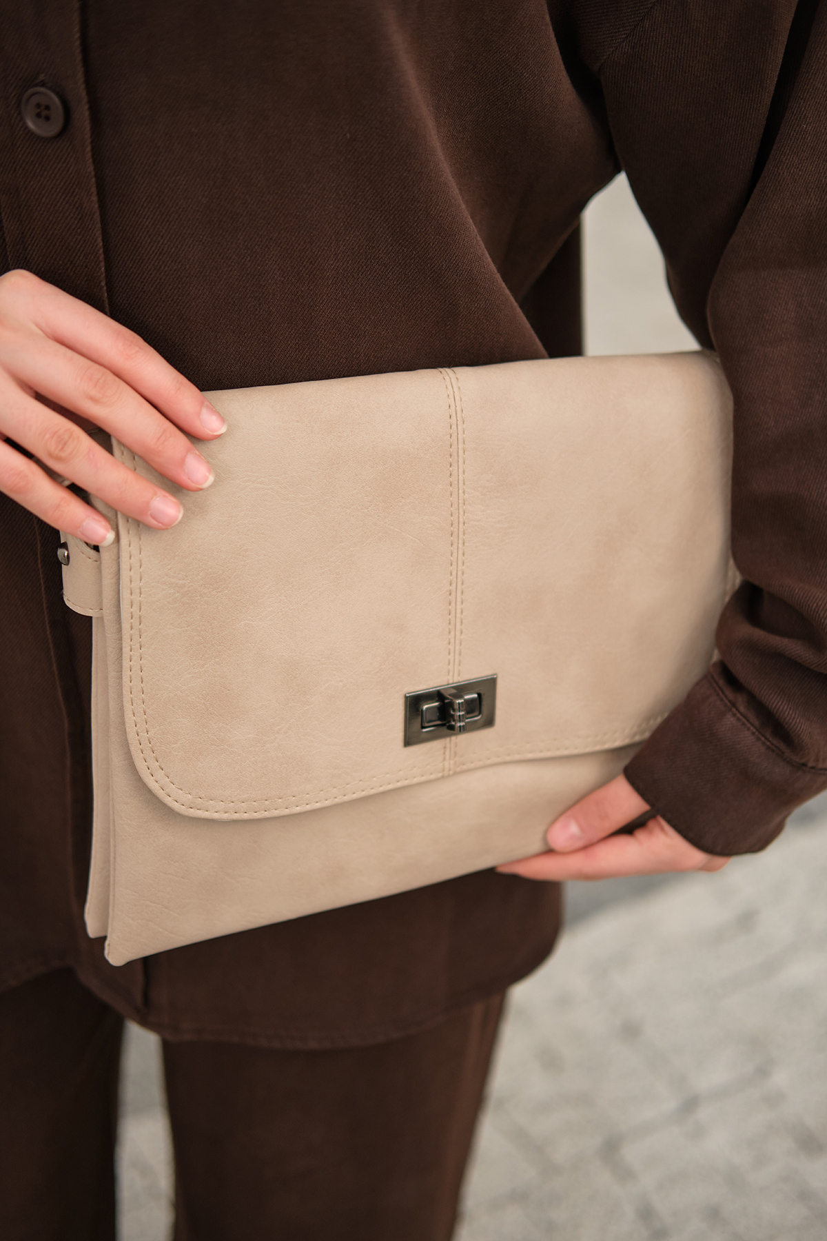 Arka Fermuar Detay Önü Çimalı Çanta Krem