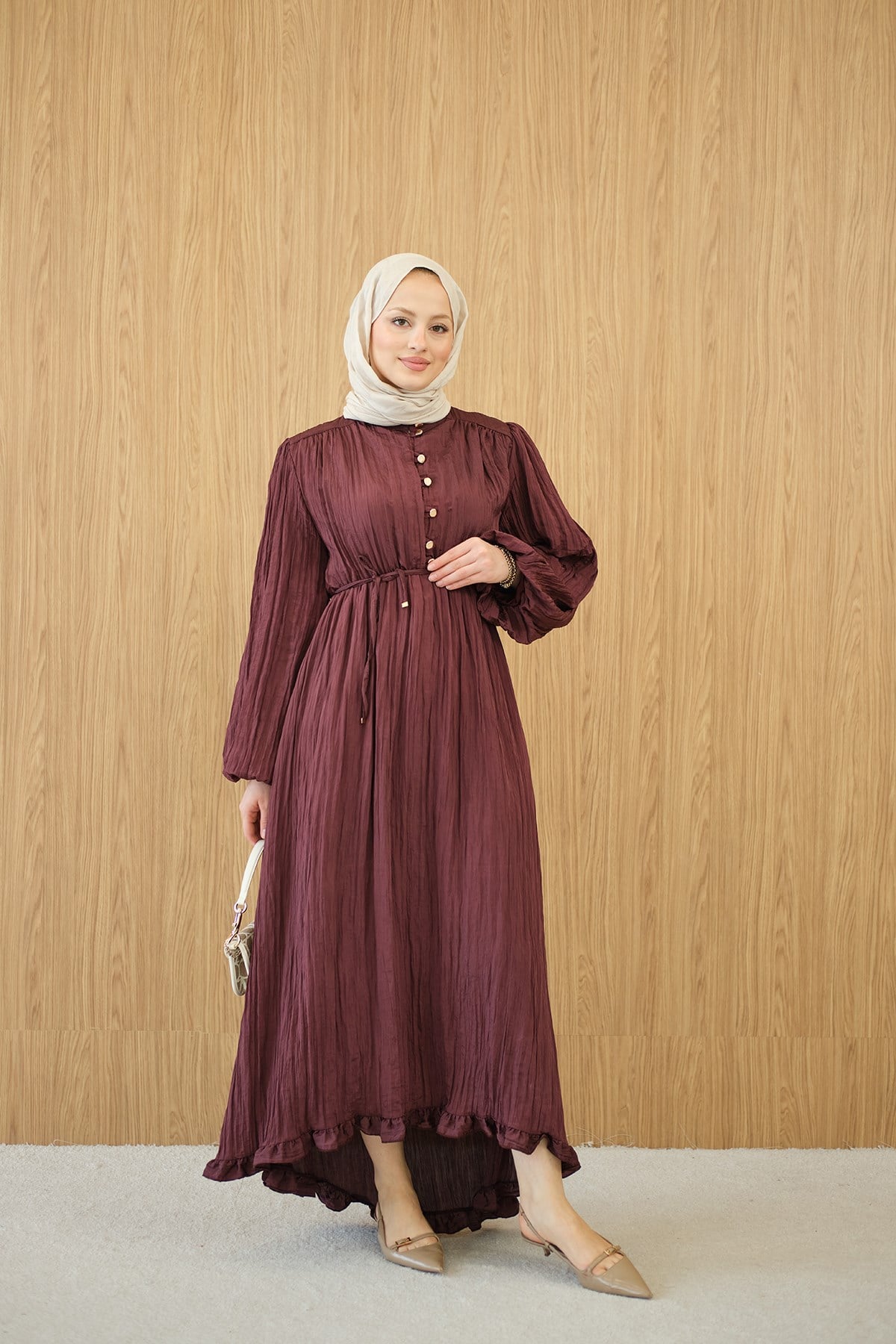 Asimetrik Fırfırlı Bel Bağlamalı Piliseli Elbise Bordo