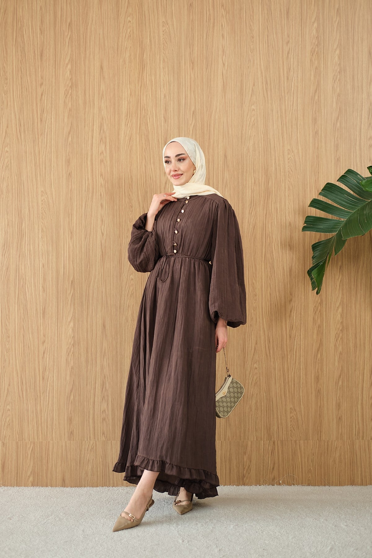 Asimetrik Fırfırlı Bel Bağlamalı Piliseli Elbise Kahverengi