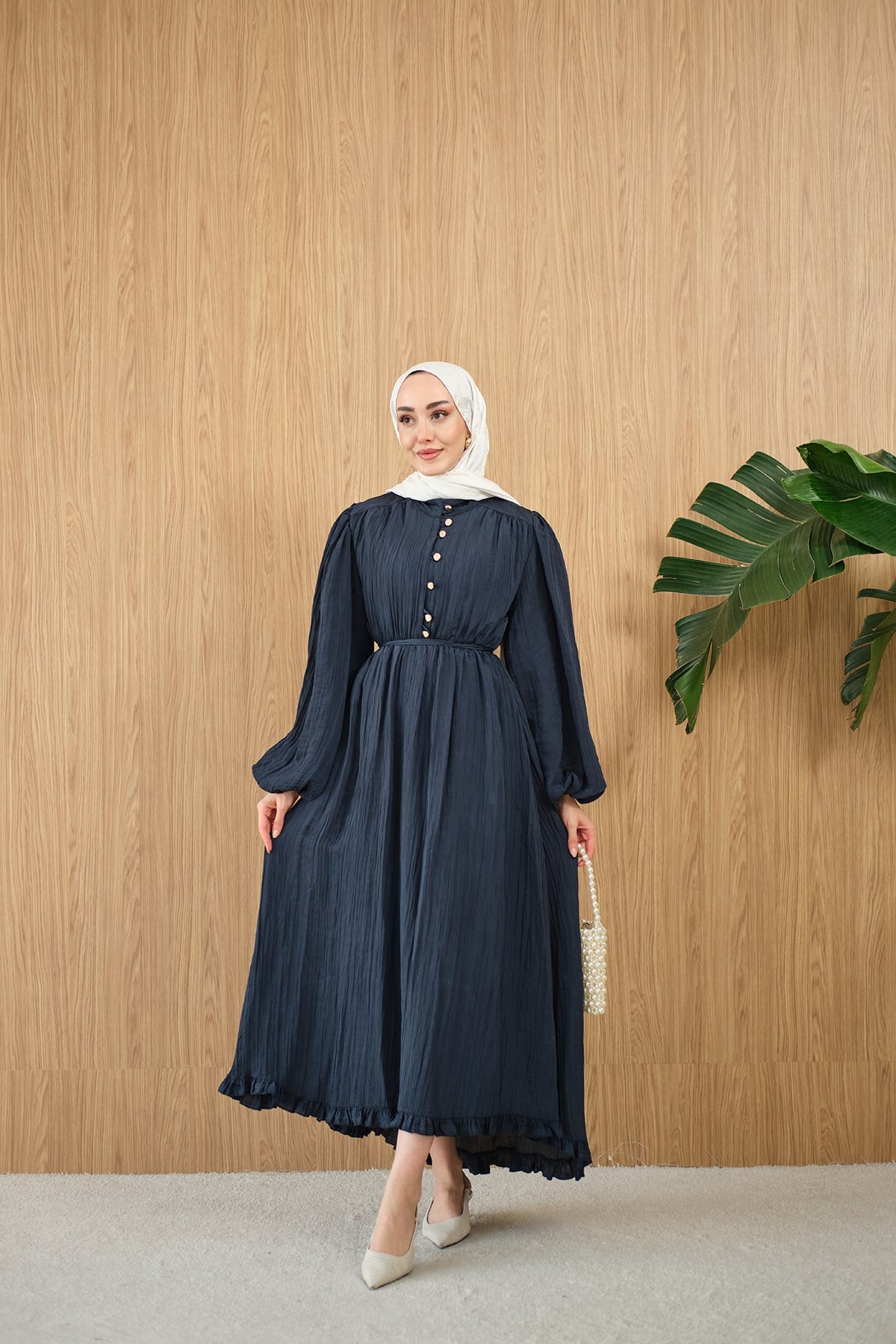 Asimetrik Fırfırlı Bel Bağlamalı Piliseli Elbise Lacivert