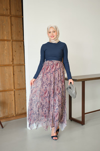 Asimetrik Kesim Etnik Desenli Şifon Etek Vişne Çürüğü