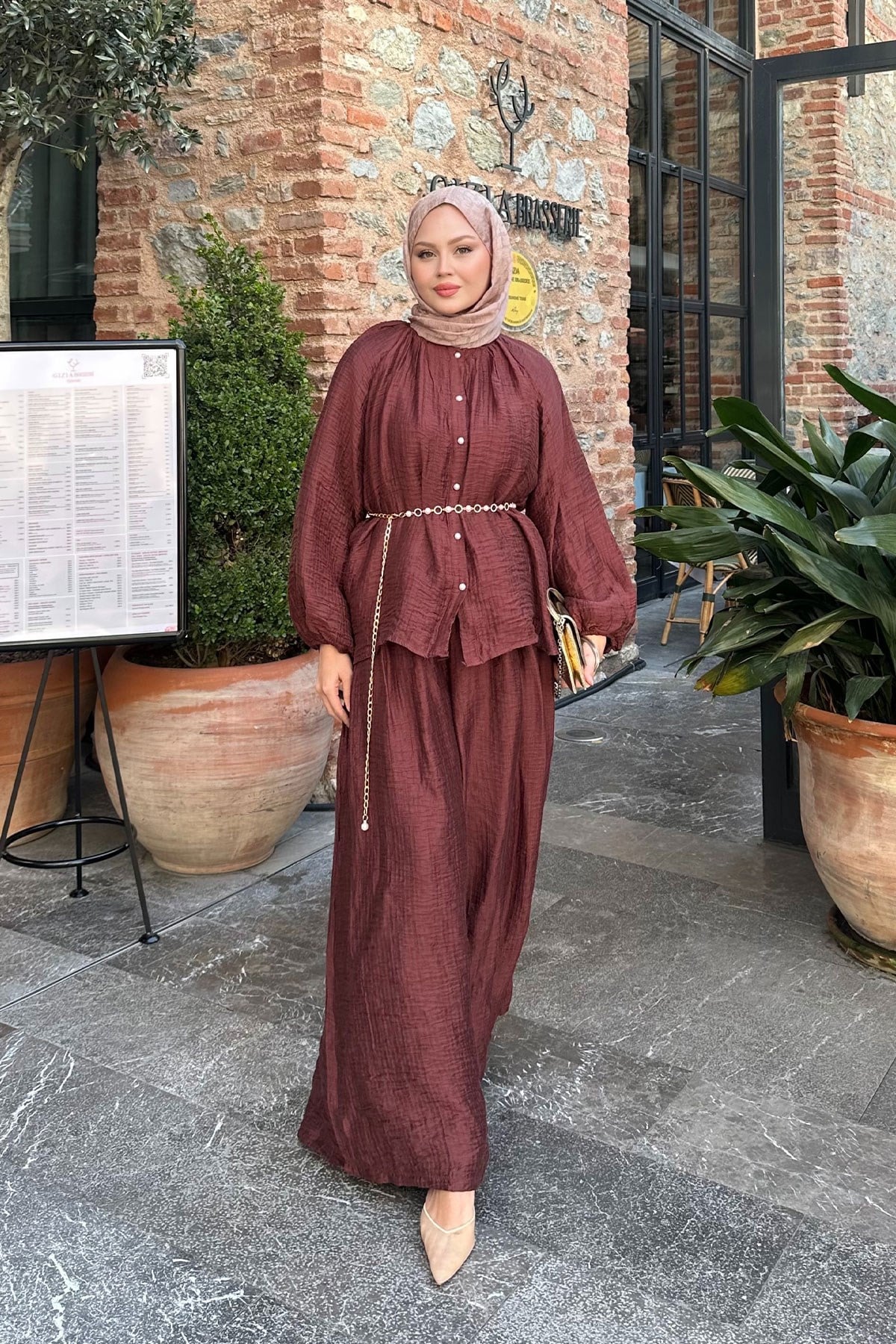 Balon Kol İnci Düğmeli Aksesuarlı Pantolonlu Takım Bordo