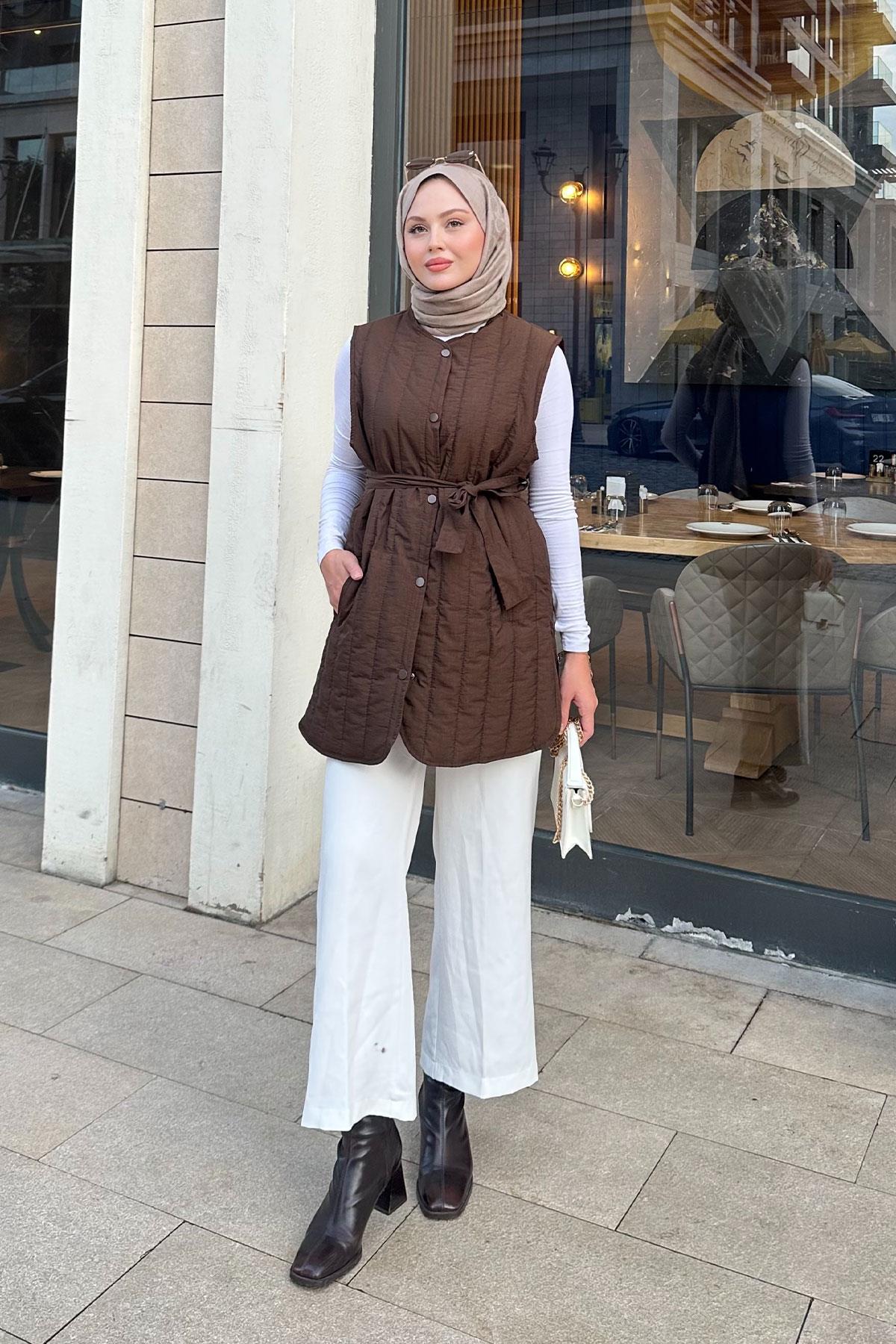 Bel Bağlamalı İnce Yelek  Kahverengi