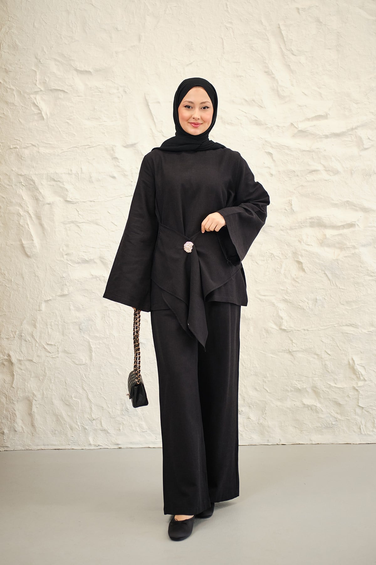 Bel Bağlamalı Pantolonlu Takım Siyah
