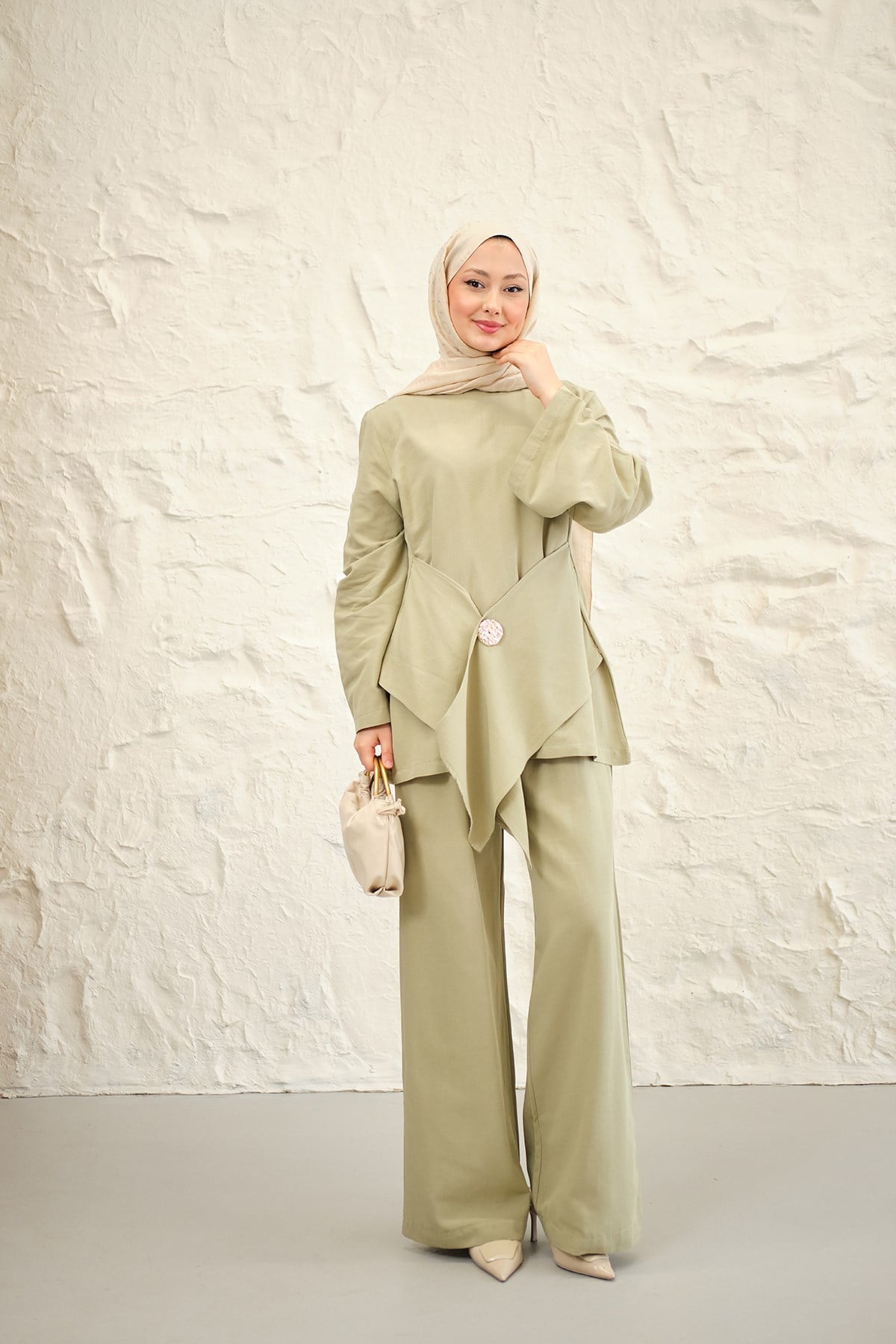 Bel Bağlamalı Pantolonlu Takım Su Yeşil