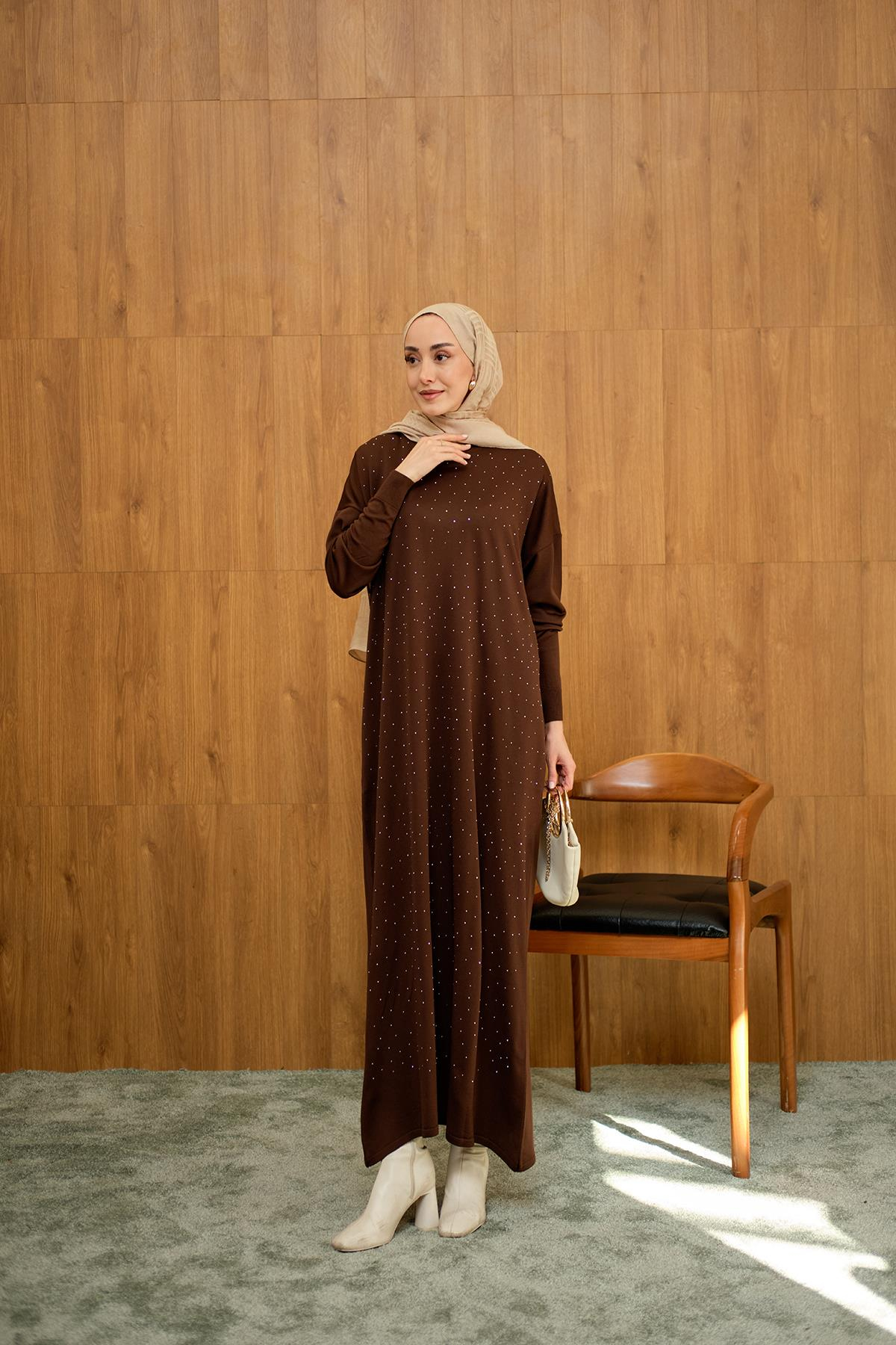 Bel Bağlamalı Taş Detay Triko Elbise Kahverengi