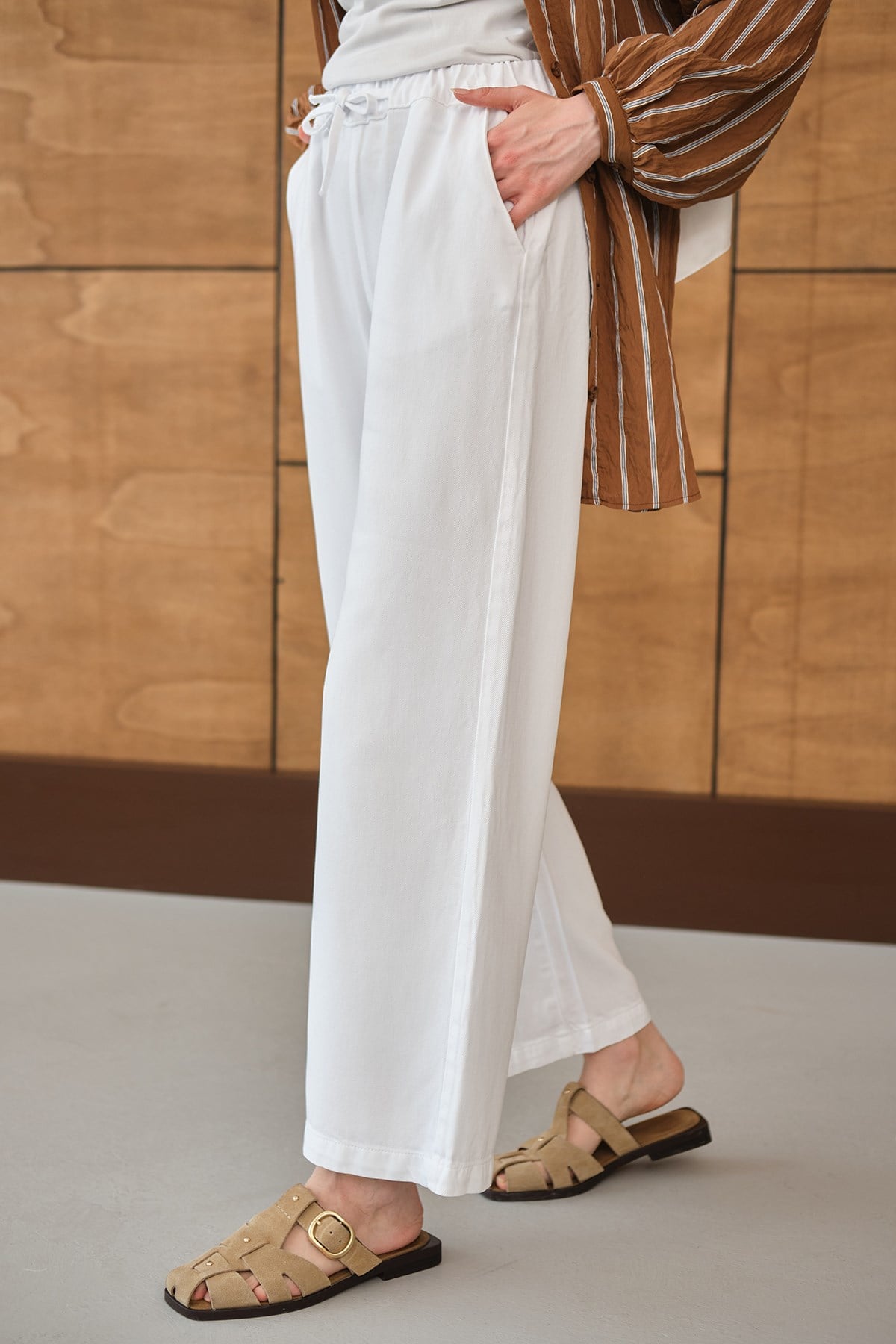 Bel Lastikli Bol Pantolon Beyaz