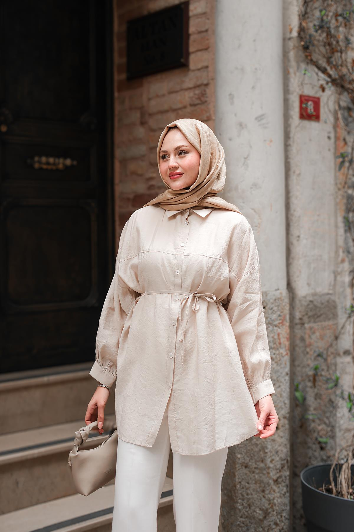 Belden Bağlamalı Gömlek Krem
