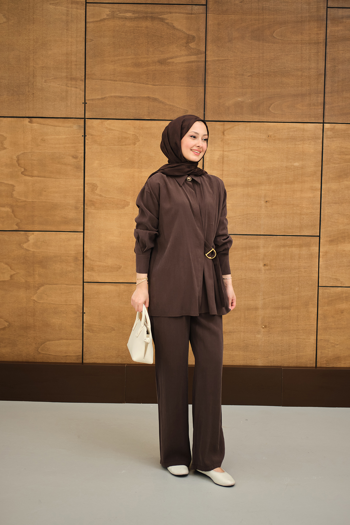 Beli Gold Kemer Detay Gömlek Yaka Takım Kahverengi