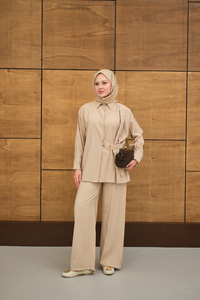 Beli Gold Kemer Detay Gömlek Yaka Takım Krem