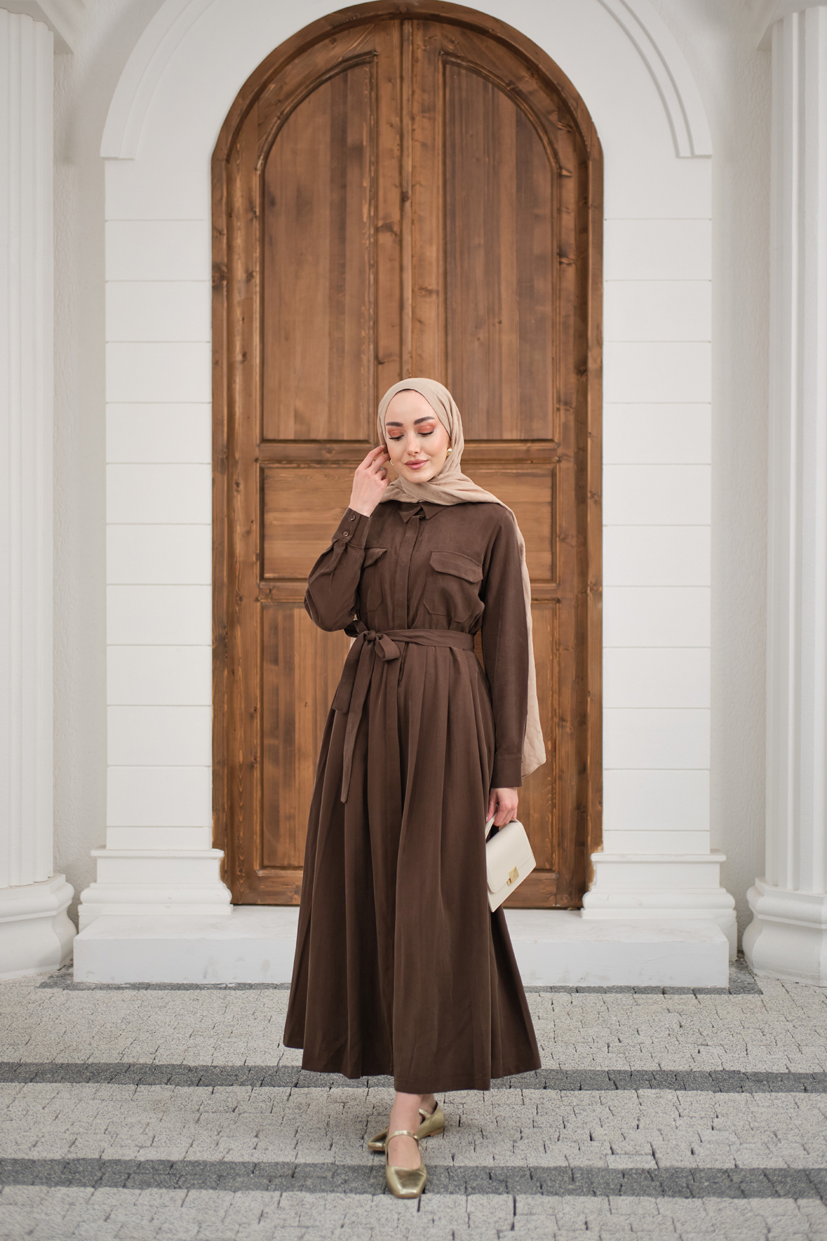 Beli Kuşak Detay Gömlek Elbise Kahverengi