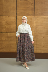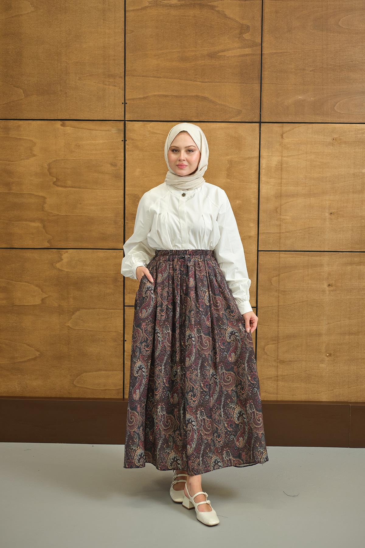 Beli Lastikli Cep Detay Etnik Desen Etek Bordo
