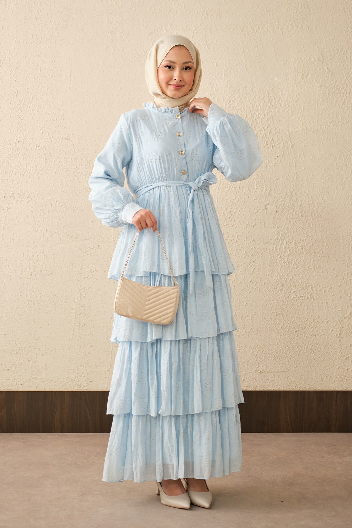 Beli Lastikli Gold Düğme Detaylı Volanlı Elbise Mavi