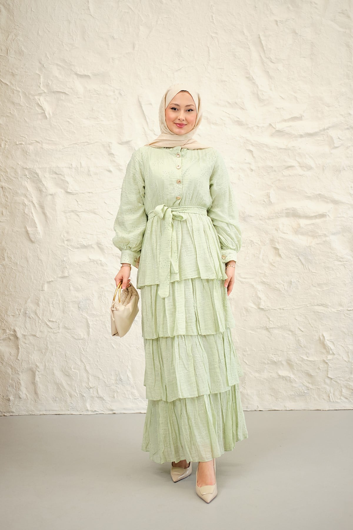 Beli Lastikli Gold Düğme Detaylı Volanlı Elbise Yeşil