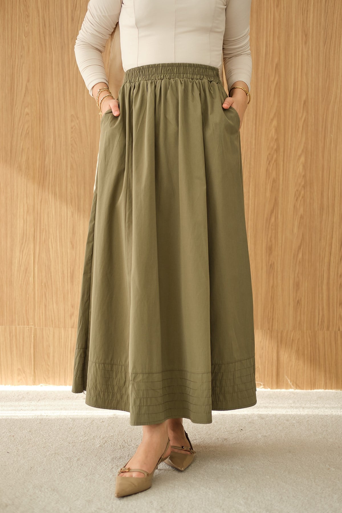 Beli Lastikli Kırışık Etek Açık Yeşil
