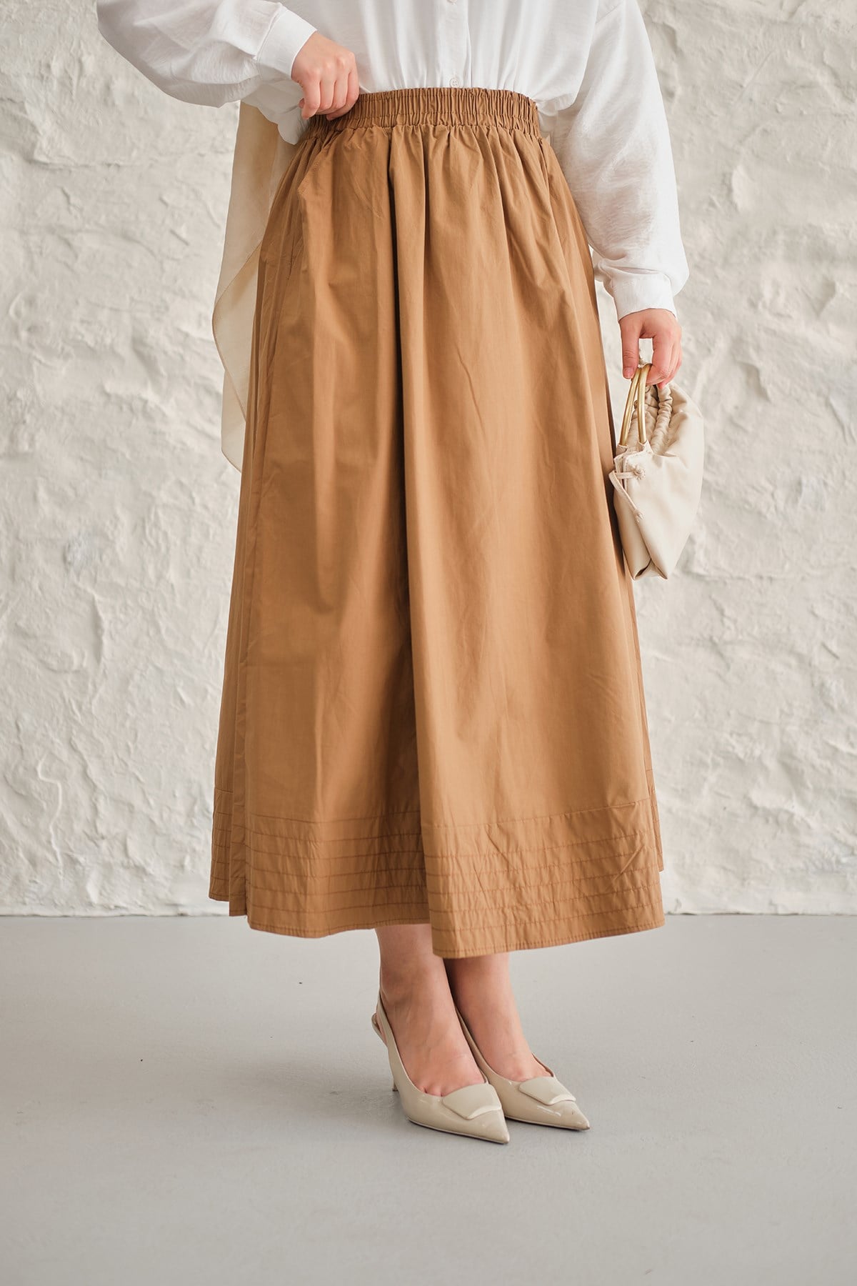 Beli Lastikli Kırışık Etek Vizon