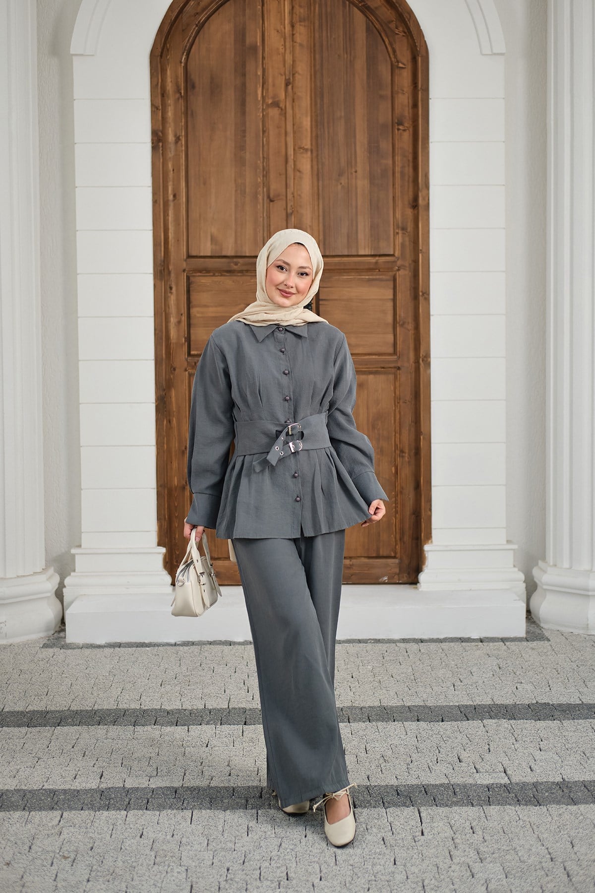 Beli Pile Detay İki Kemerli Gömlek Yaka Takım Gri