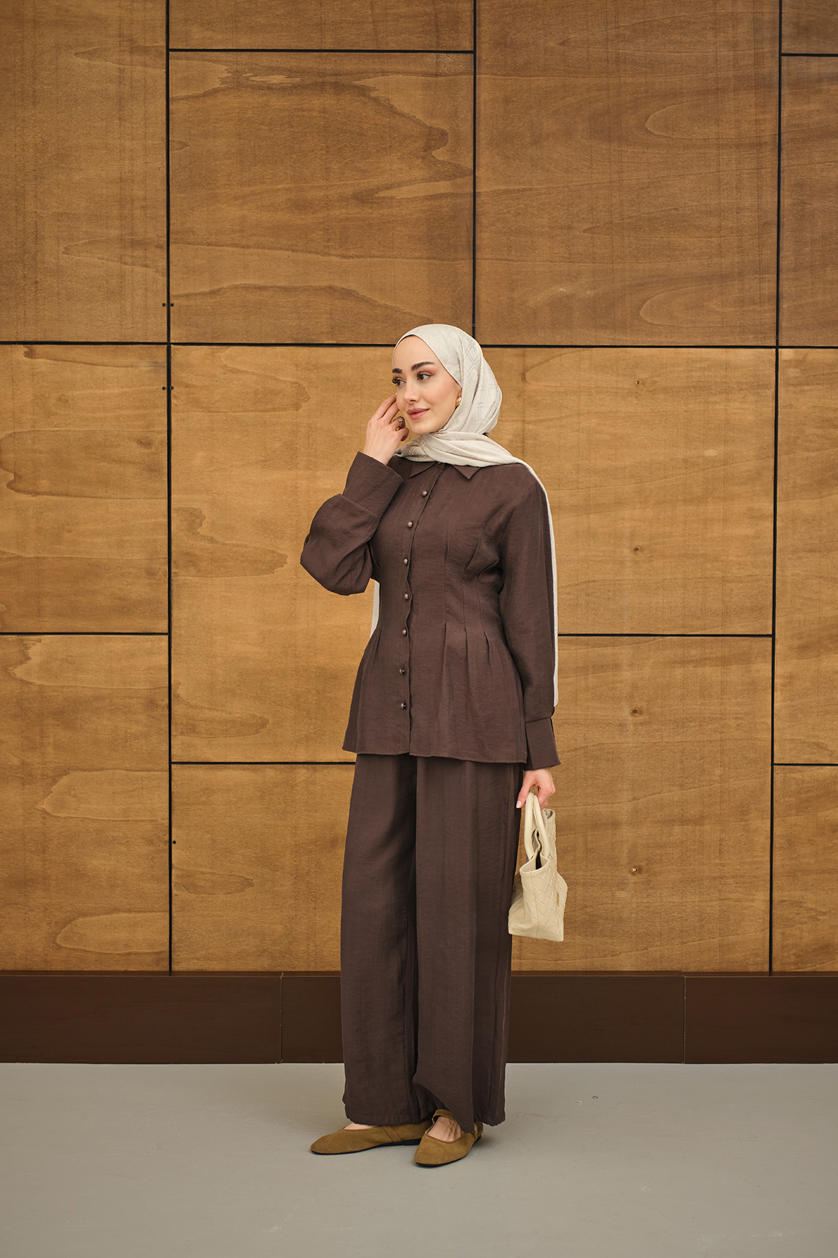 Beli Pile Detay İki Kemerli Gömlek Yaka Takım Kahverengi