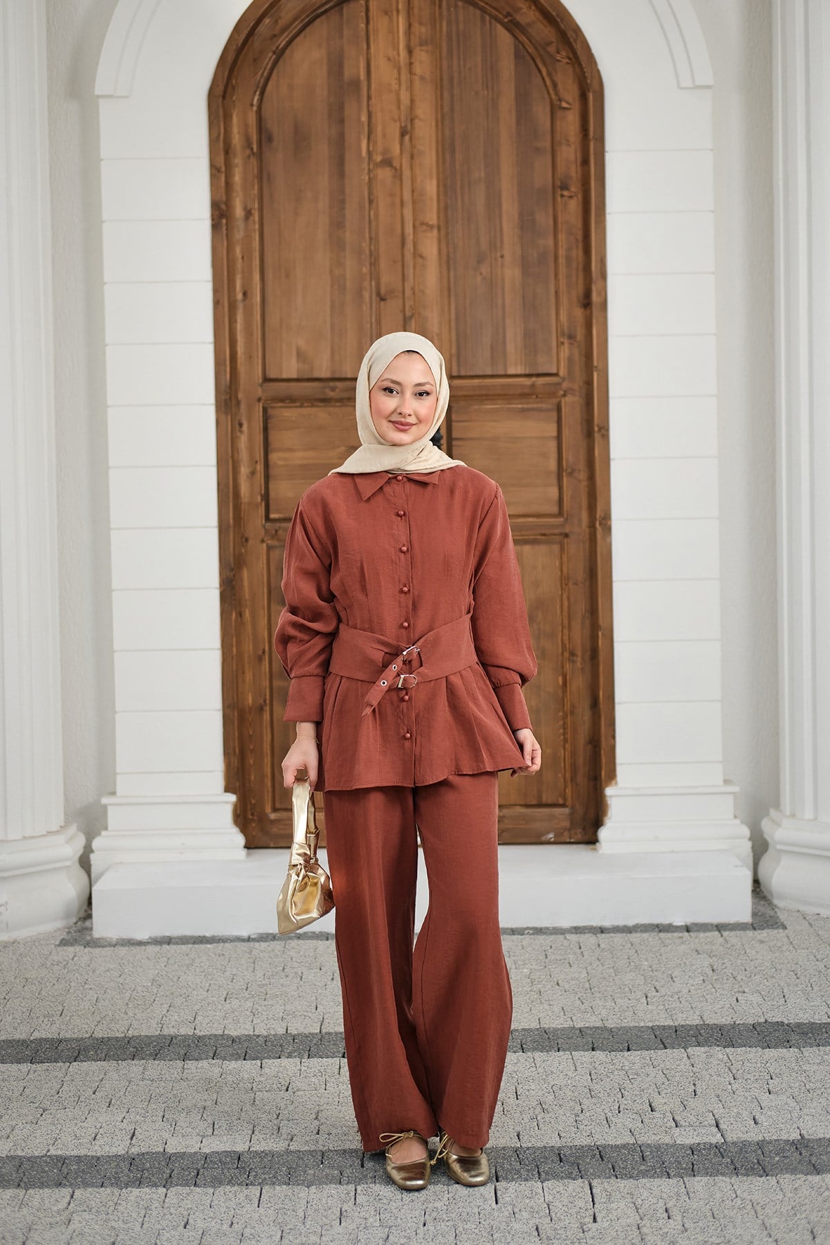 Beli Pile Detay İki Kemerli Gömlek Yaka Takım Kiremit