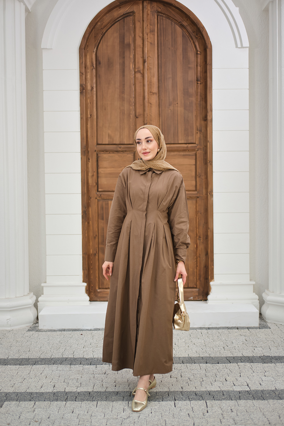 Beli Pileli Gömlek Yaka Gizli Düğmeli Elbise Kahverengi