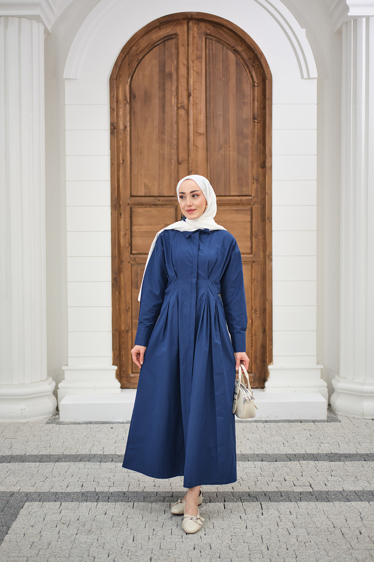 Beli Pileli Gömlek Yaka Gizli Düğmeli Elbise Lacivert