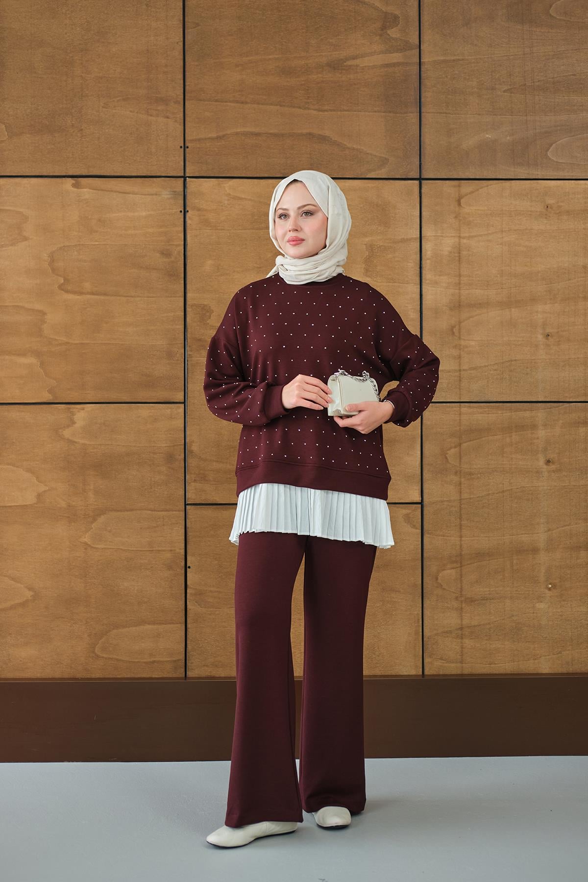 Beli Pileli Taşlı İkili Takım Bordo
