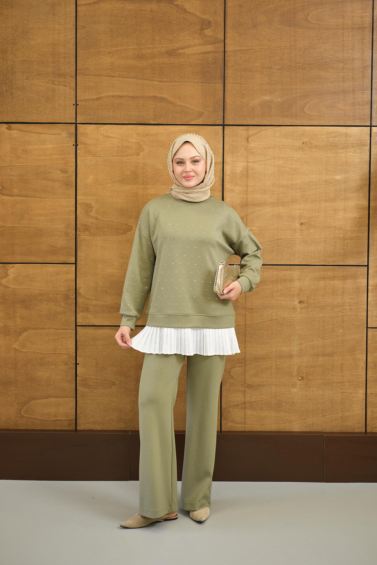 Beli Pileli Taşlı İkili Takım Haki Yeşil