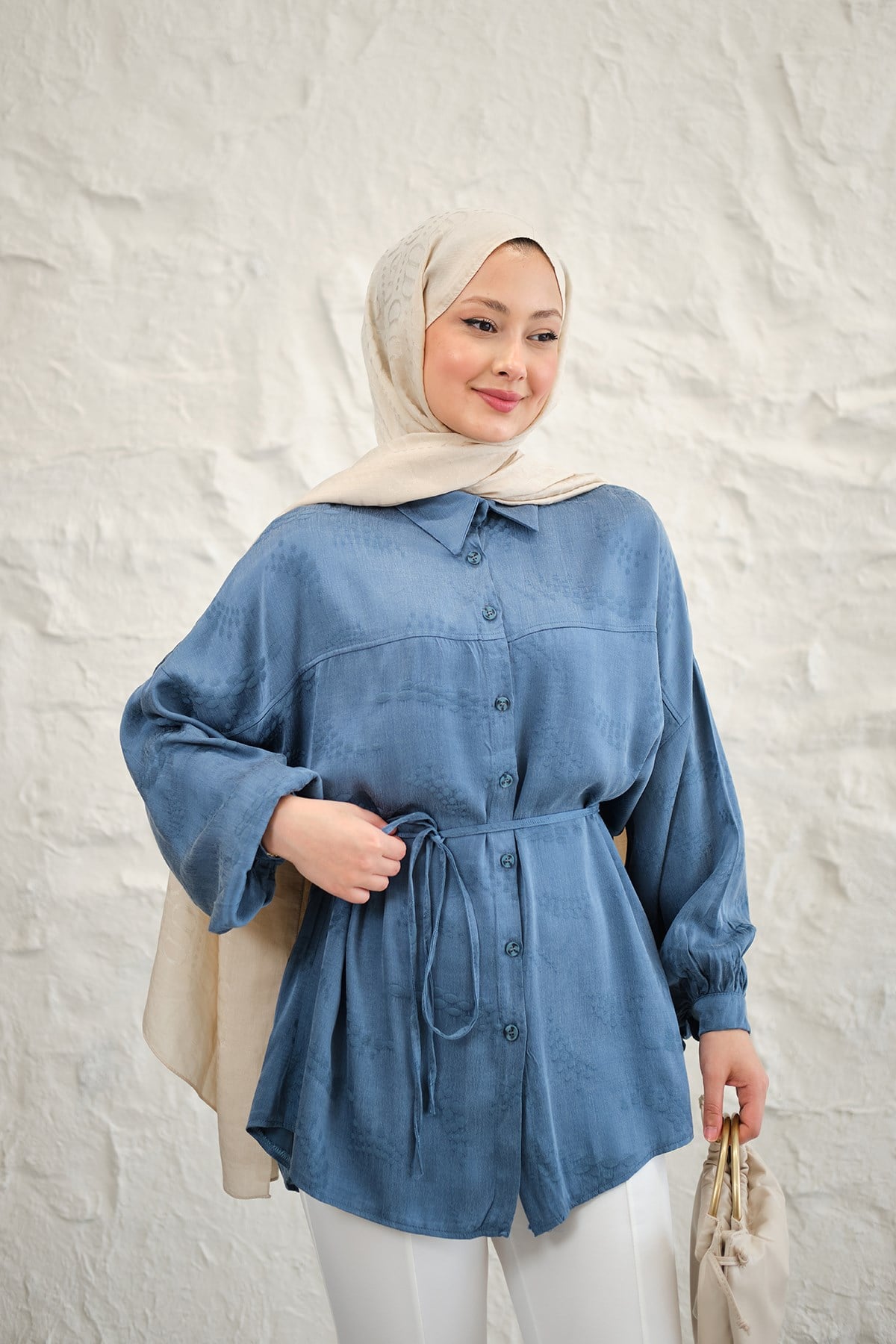 Benek Desenli Saten Bel Bağlamalı Gömlek Mavi
