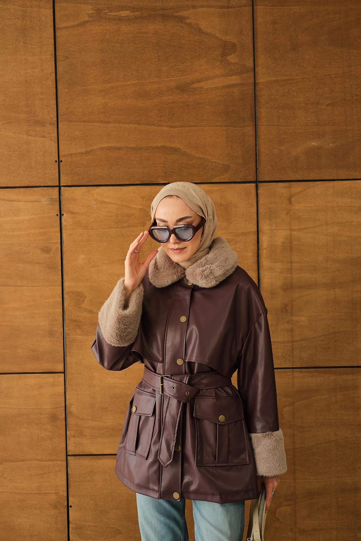 Bilek Ve Yaka Kürklü Deri Ceket Bordo