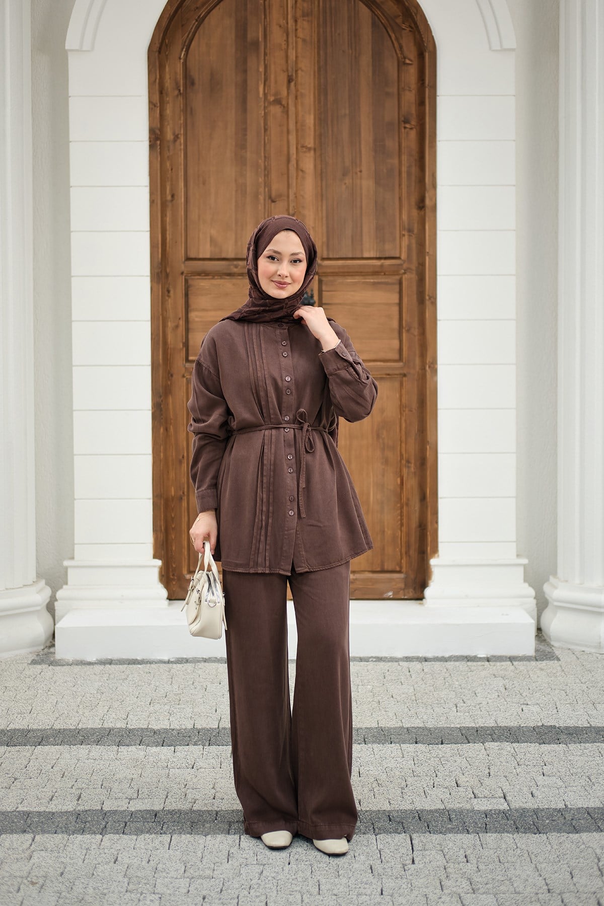 Bisiklet Yaka Bel Bağlamalı Dikiş Detay Takım Kahverengi