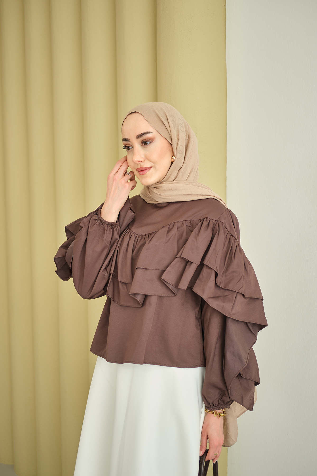 Bisiklet Yaka Büzgülü Balon Kol Tunik Kahverengi