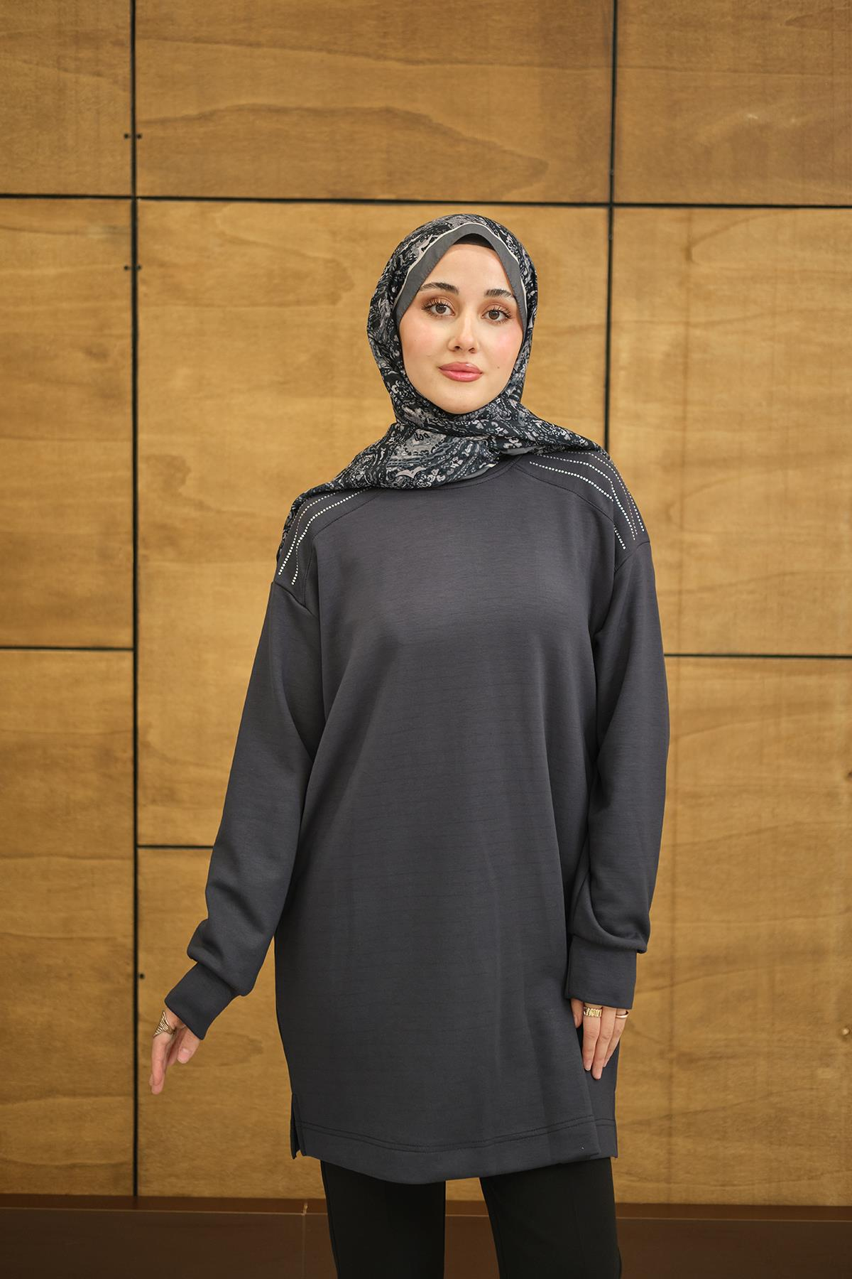 Bisiklet Yaka Omuz Taş Detay Regular Viskon Tunik Antrasit