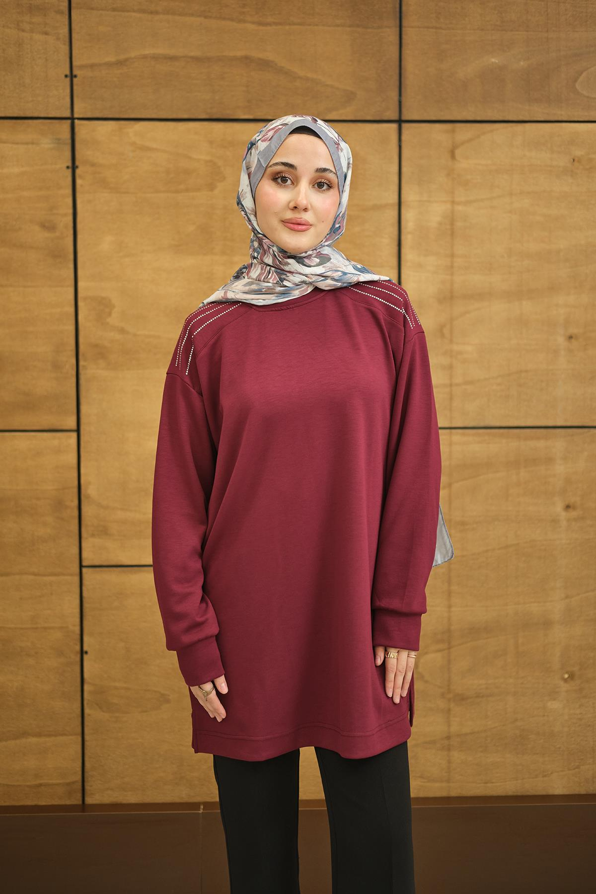 Bisiklet Yaka Omuz Taş Detay Regular Viskon Tunik Bordo