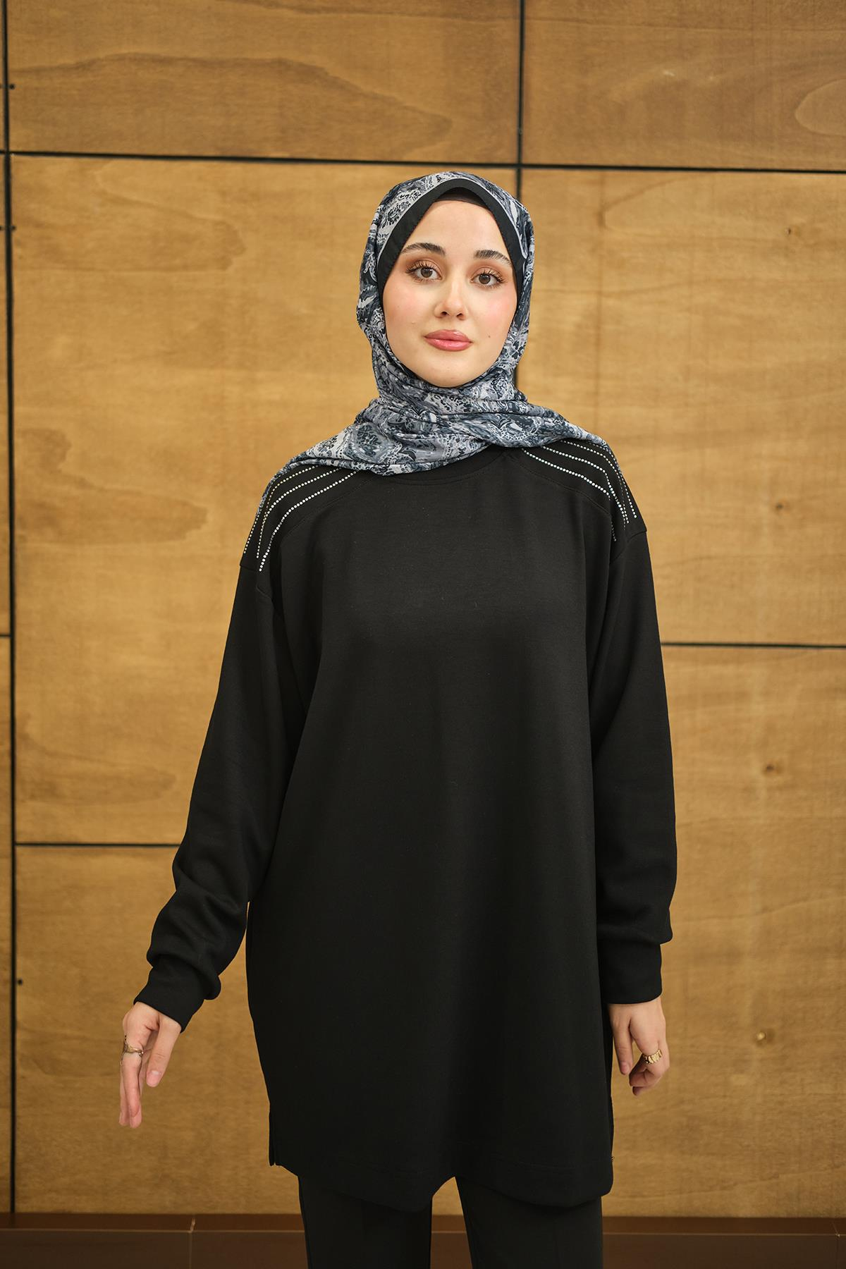 Bisiklet Yaka Omuz Taş Detay Regular Viskon Tunik Siyah
