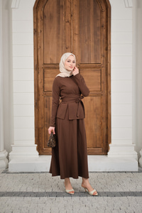 Bisiklet Yaka Ön Yırtmaçlı Etekli Takım Kahverengi
