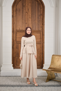 Bisiklet Yaka Ön Yırtmaçlı Etekli Takım Krem