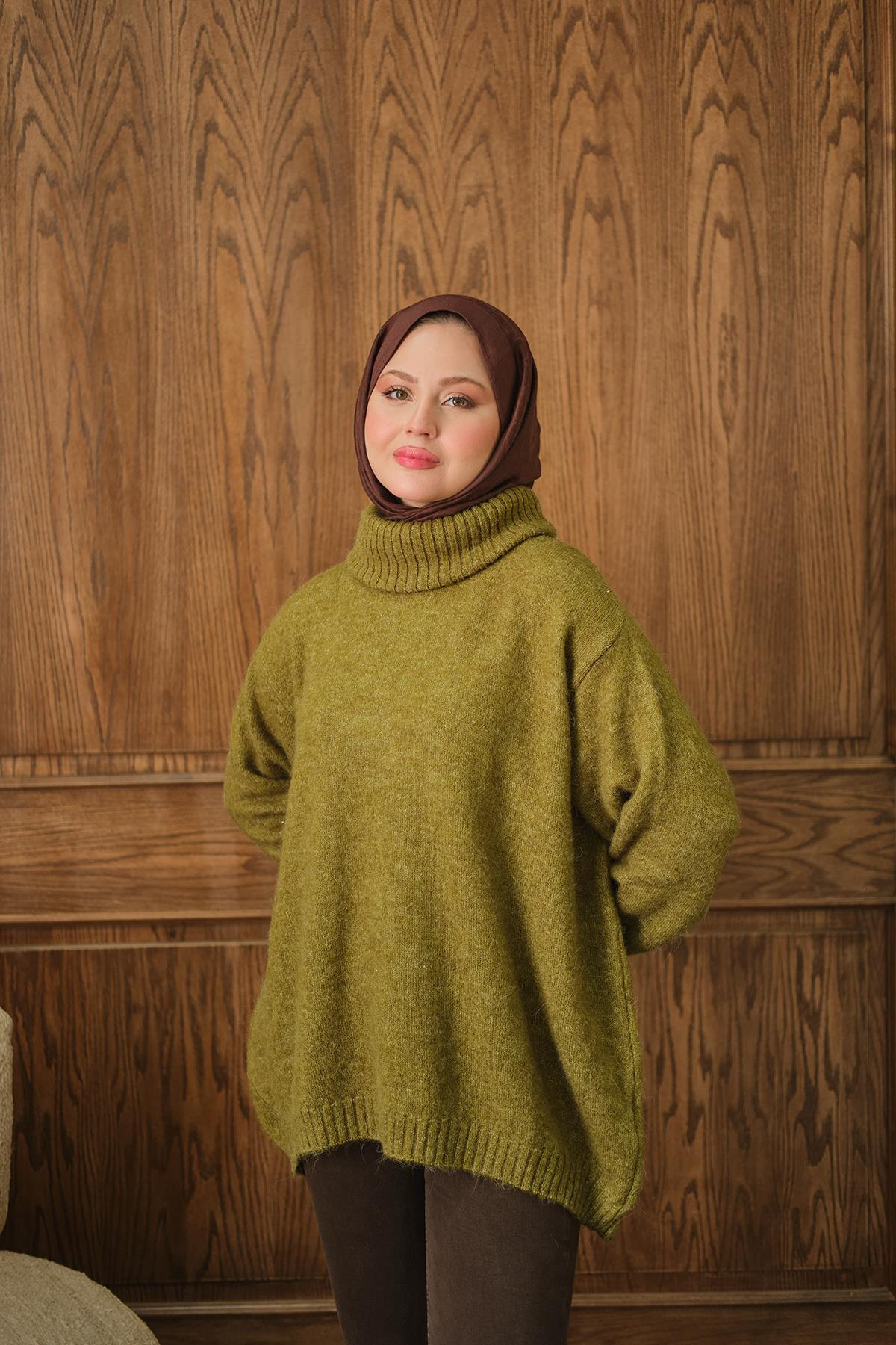 Boğazlı Triko Kazak Yağ Yeşil