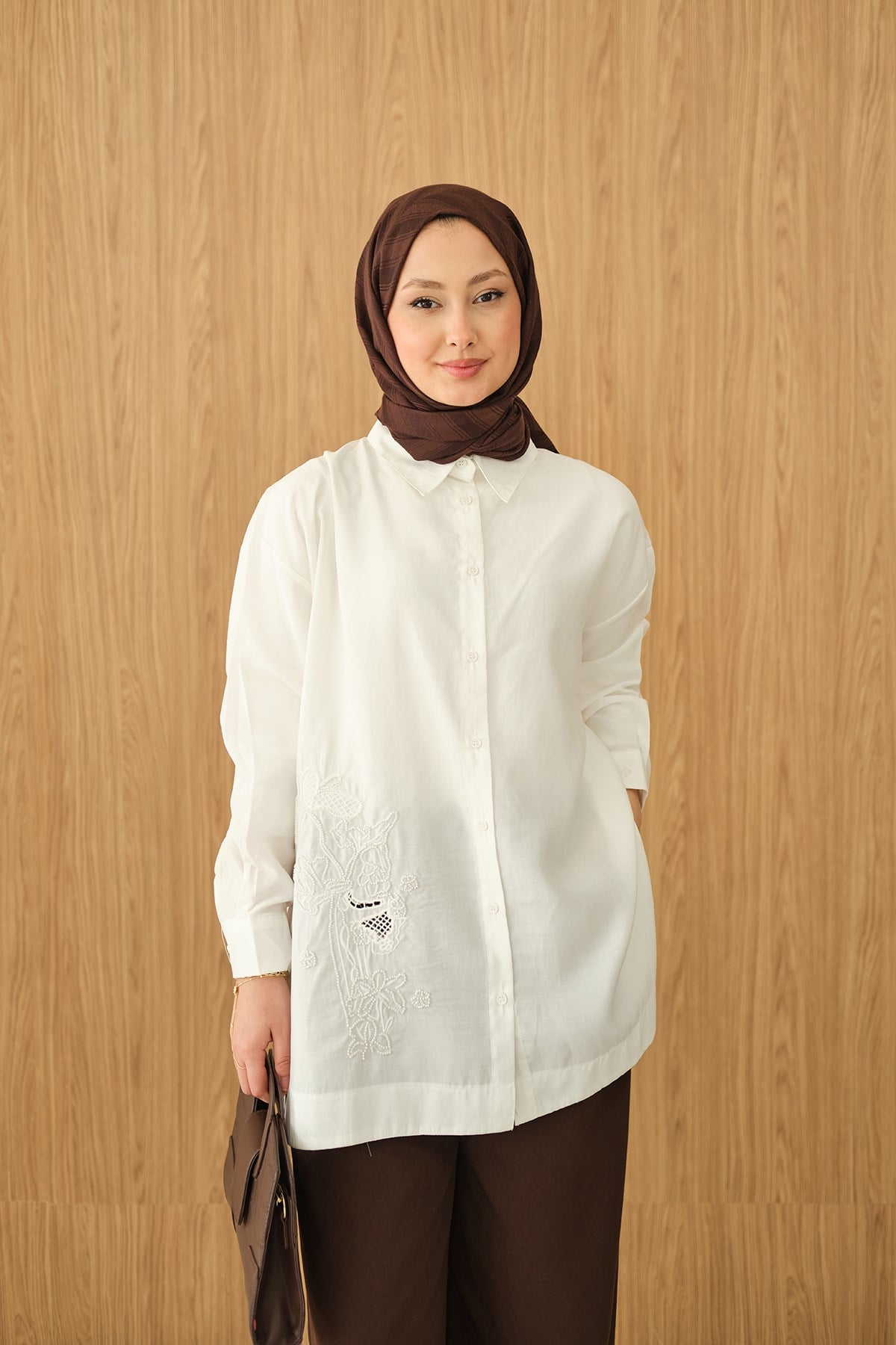 Boncuk Nakış Detaylı Gömlek Beyaz