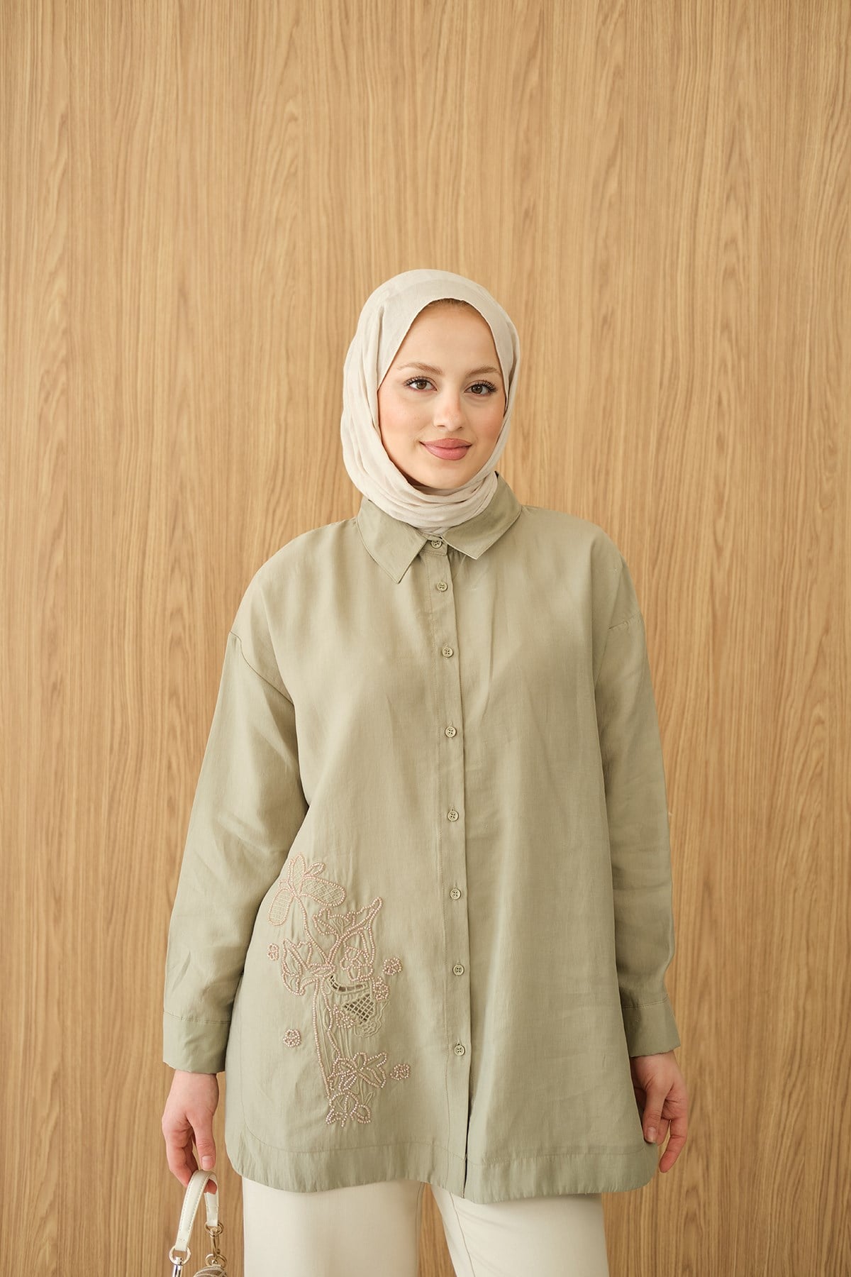 Boncuk Nakış Detaylı Gömlek Haki Yeşil