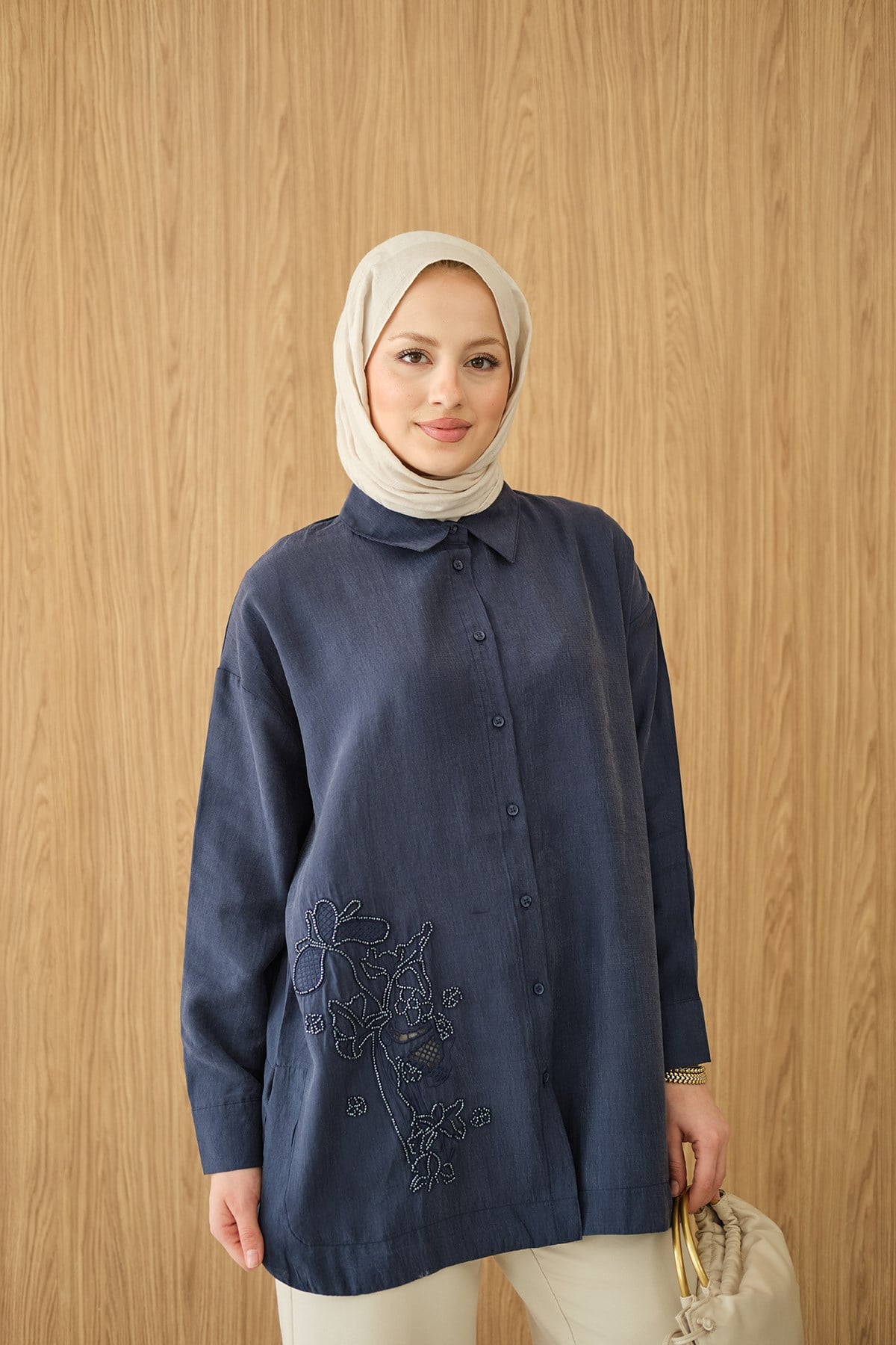 Boncuk Nakış Detaylı Gömlek Lacivert