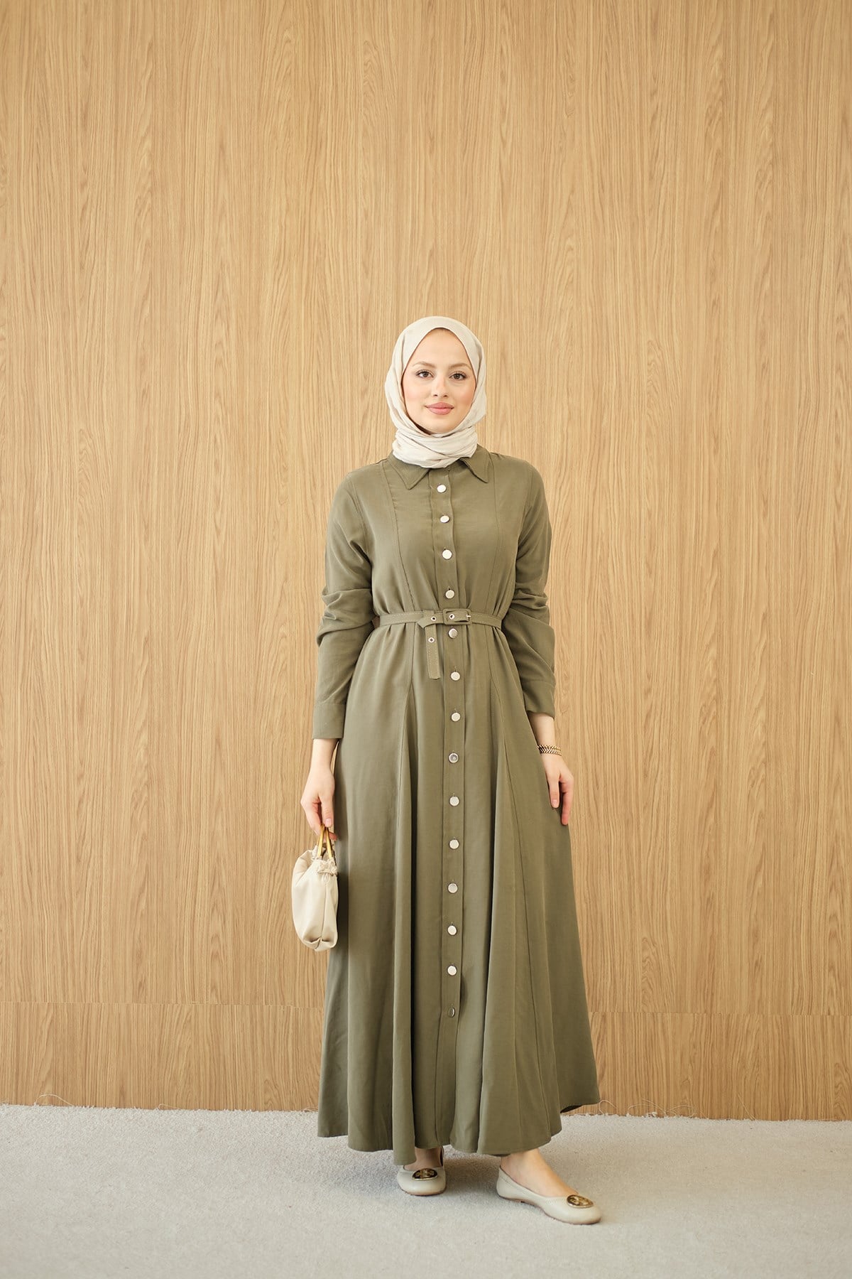 Boydan Düğmeli Kemerli Elbise Küf Yeşil