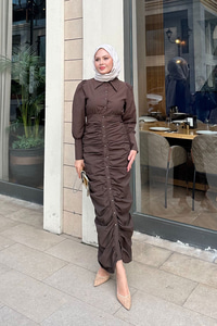 Boydan Düğmeli Önü Büzgü Detay Elbise Kahverengi
