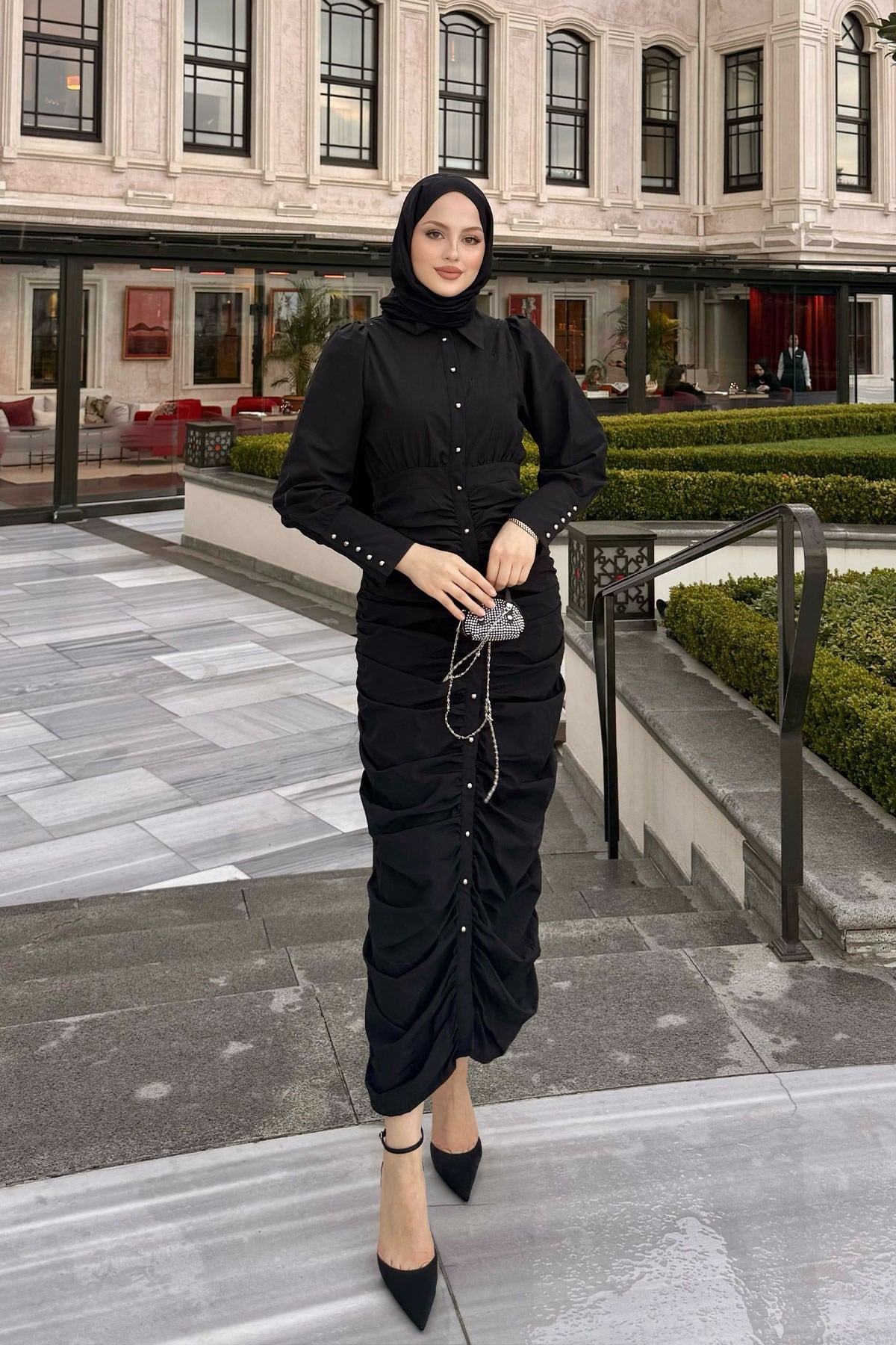 Boydan Düğmeli Önü Büzgü Detay Elbise Siyah