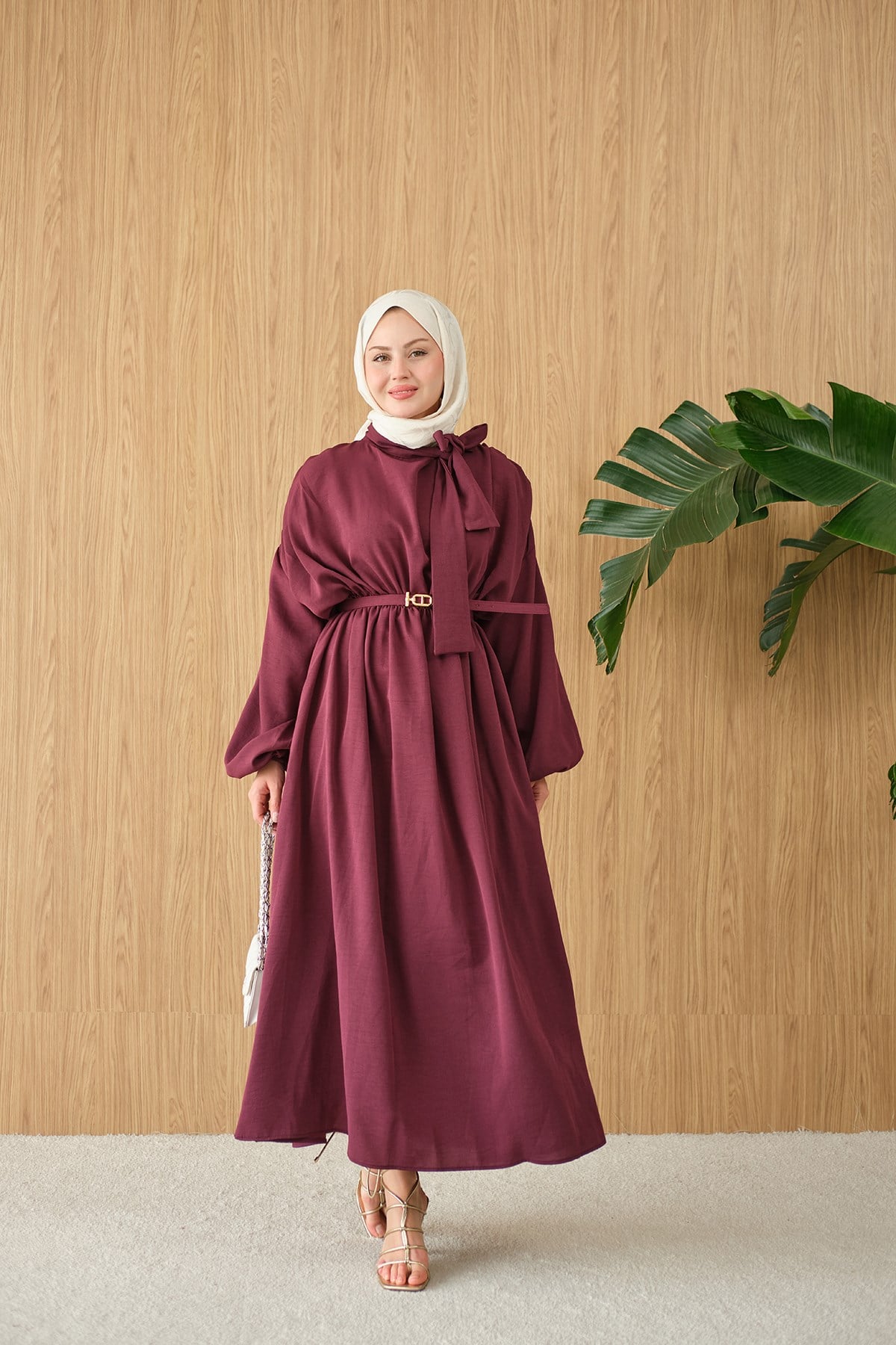 Boyun Bağlamalı Kemerli Elbise Mürdüm
