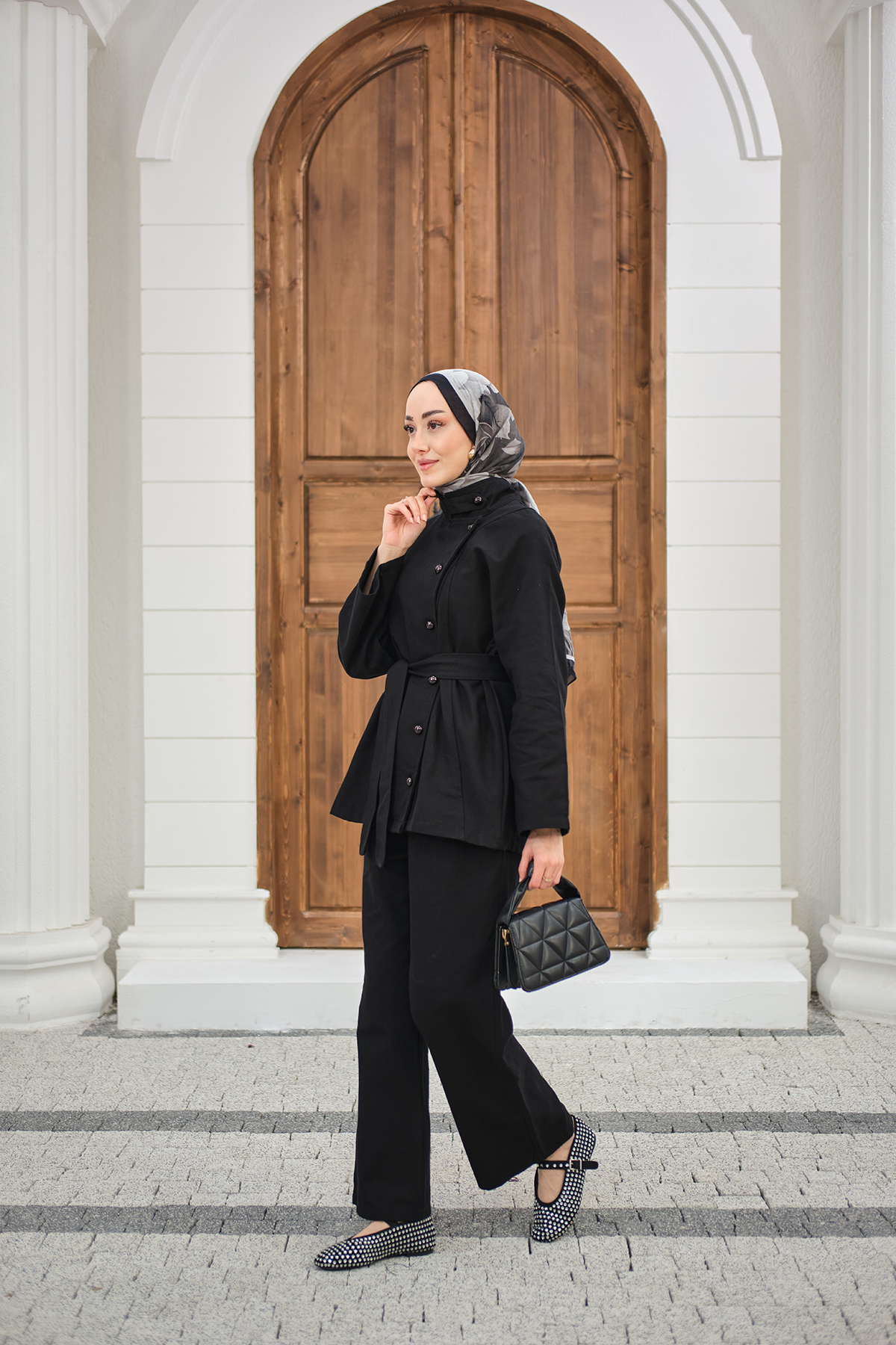 Boyun Düğme Detay Bel Bağlamalı Kot Takım Siyah