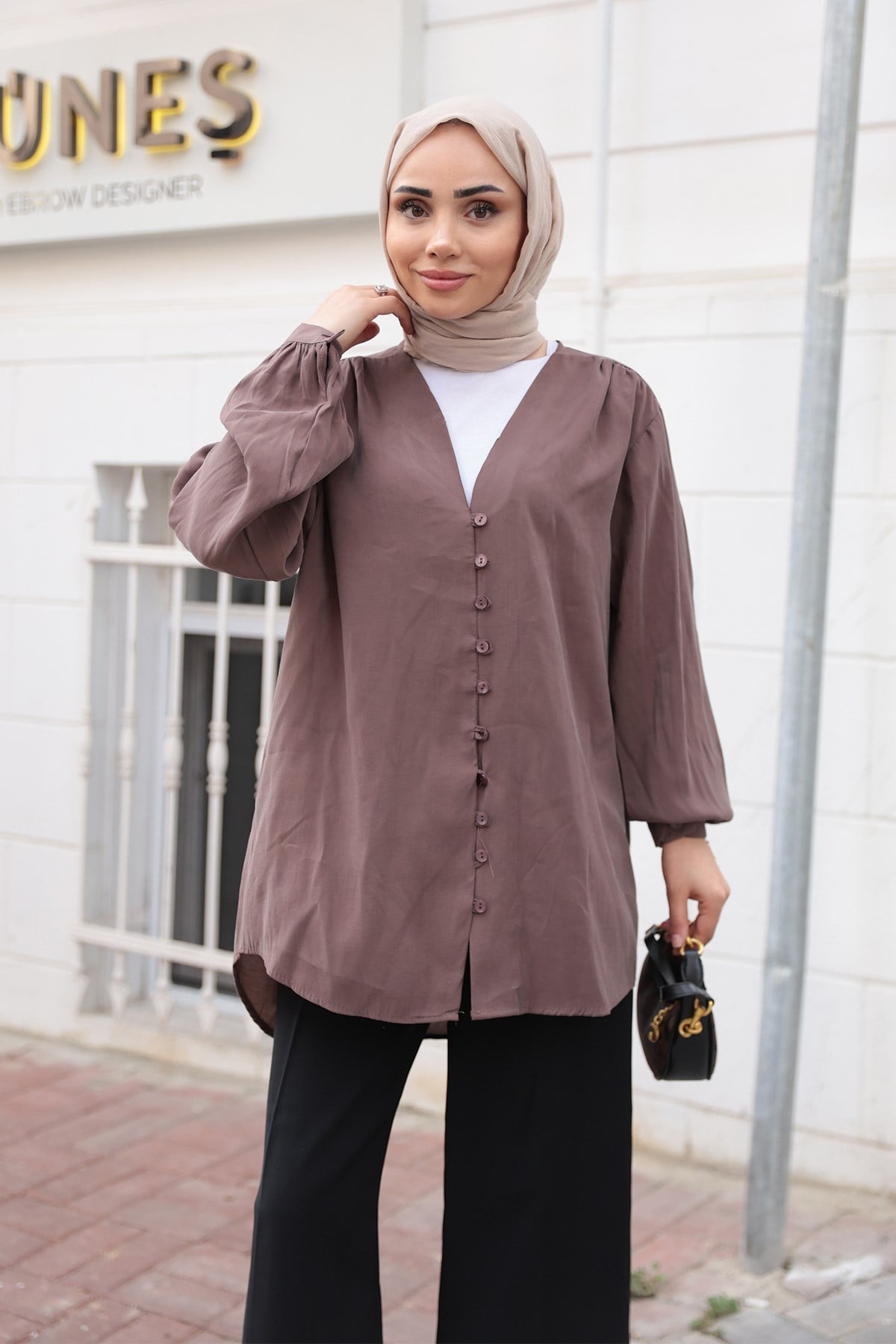 Brit Düğme Detaylı Vual Gömlek Kahverengi
