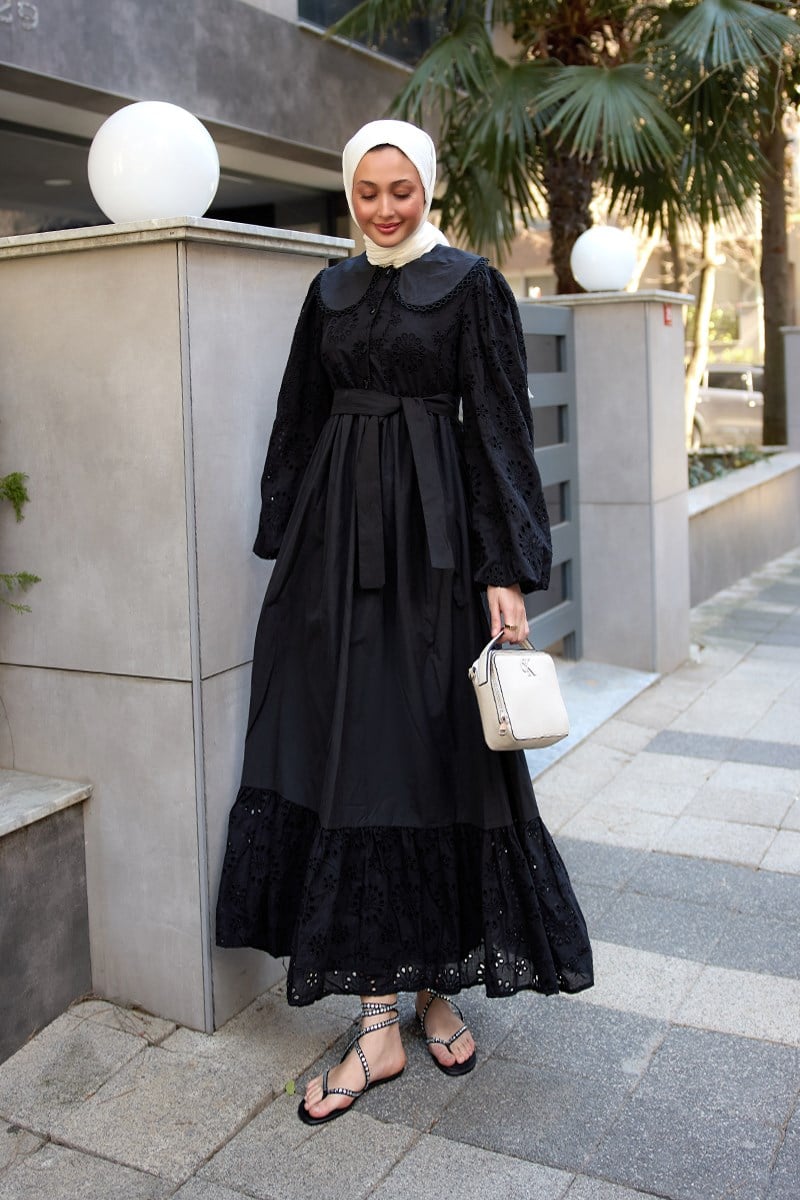 Brode Detaylı Bebe Yaka Elbise Siyah