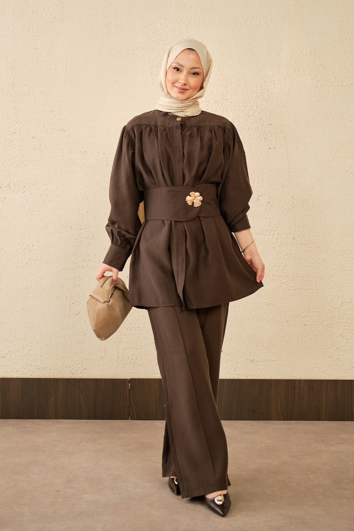 Broş Detay Gizli Düğmeli Takım Acı Kahve